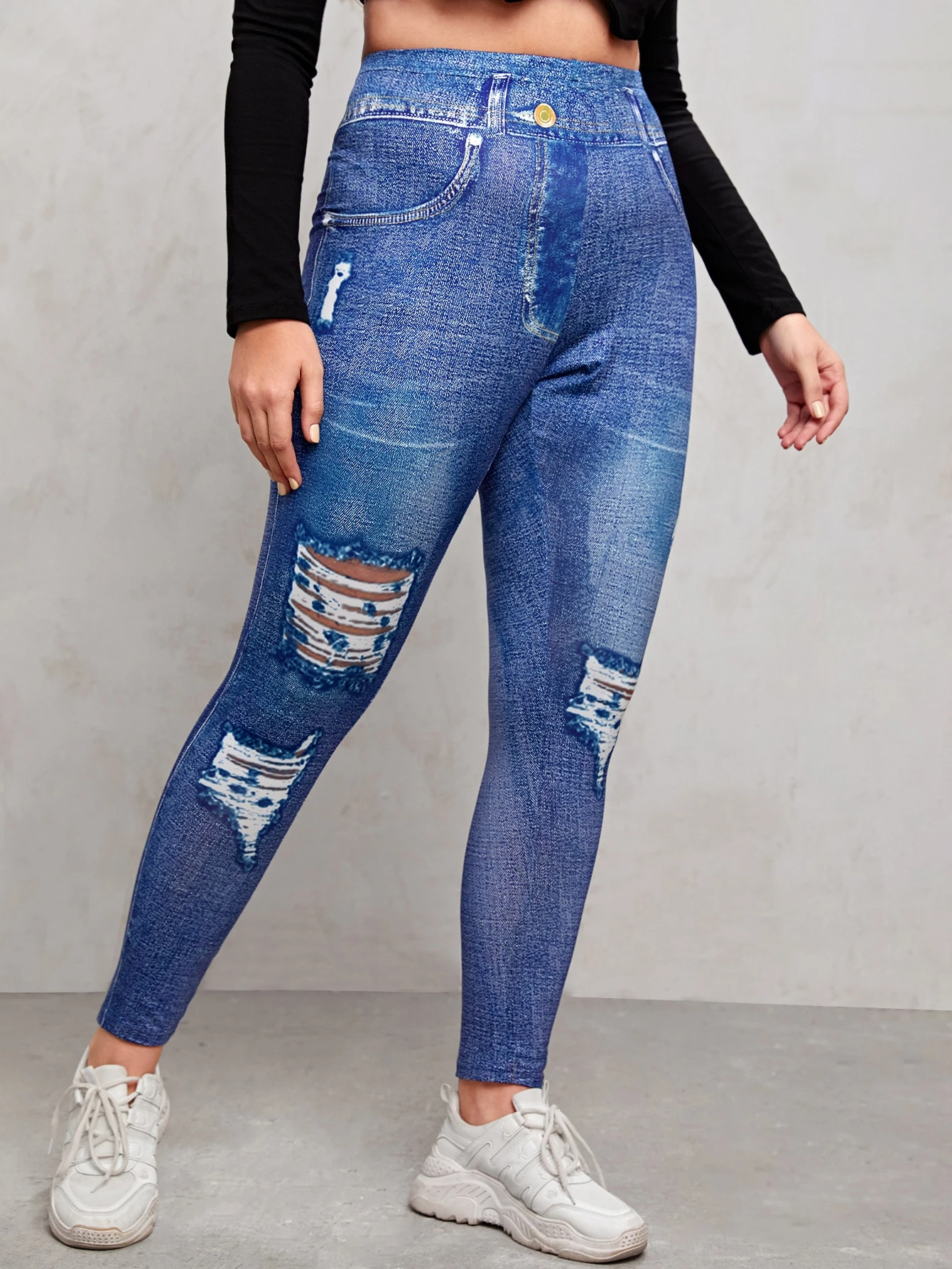 Plus Size Imitation Ripped Print Denim Effect Leggings