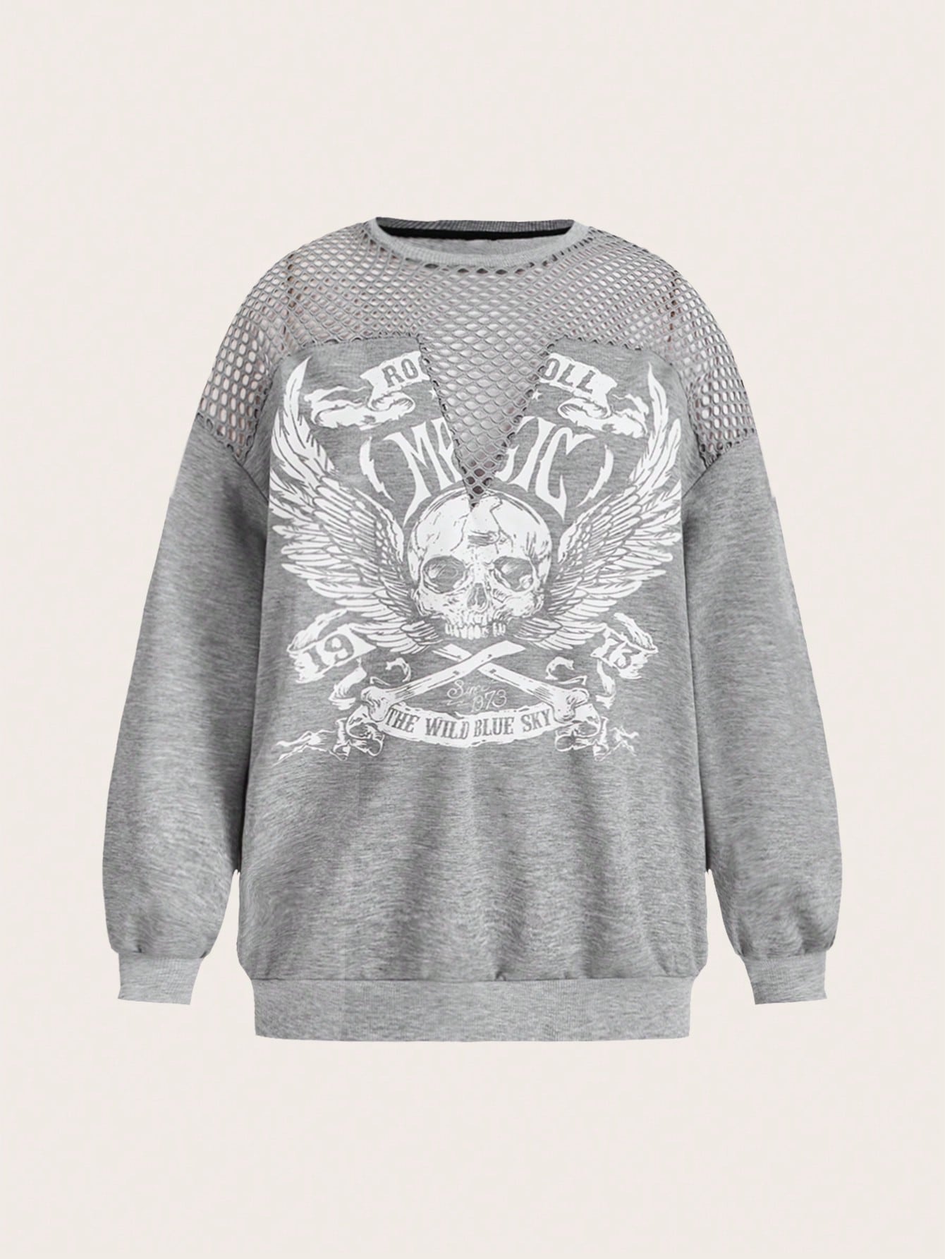 Plus Size Mesh Panel Skull Print Sweatshirt