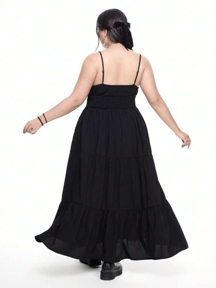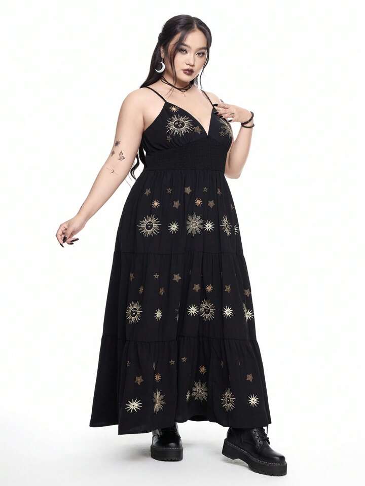 Plus Size Mysterious Bohemian Gothic Star & Moon Embroidered Dress With V-Neck Spaghetti Straps