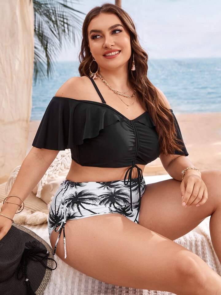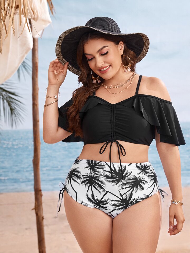 Plus Size Palm Tree Print Ruffle Bikini Set Summer Beach