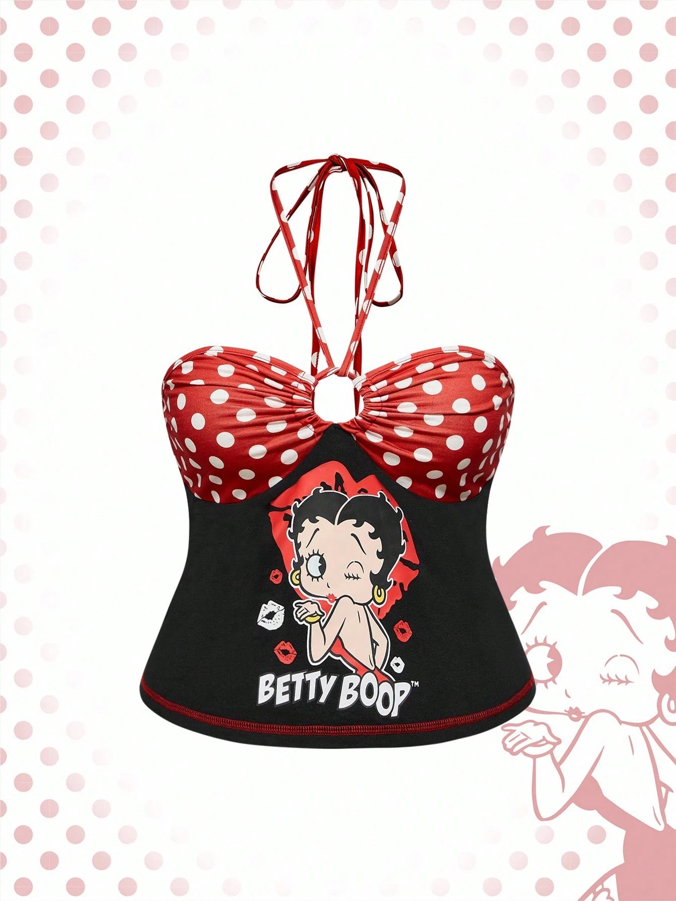 Betty Boop | ROMWE Plus Size Sexy Cute Cartoon Graphic Contrast Polka Dot HalterTop For Summer
