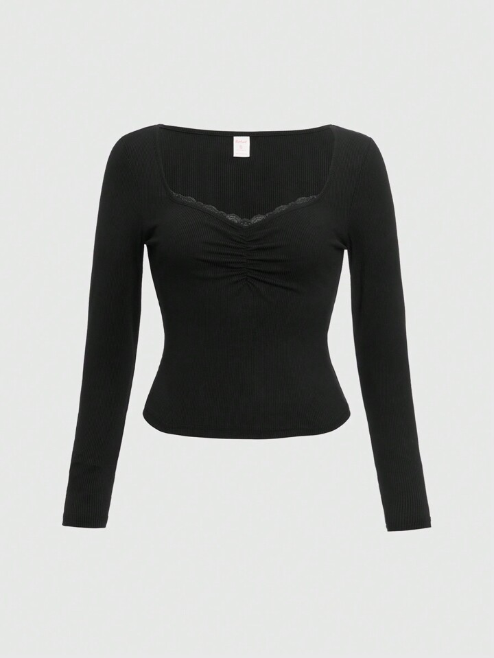 Plus Size Solid Color Lace Trim Ruched Sweetheart Neck Long Sleeve Casual T-Shirt