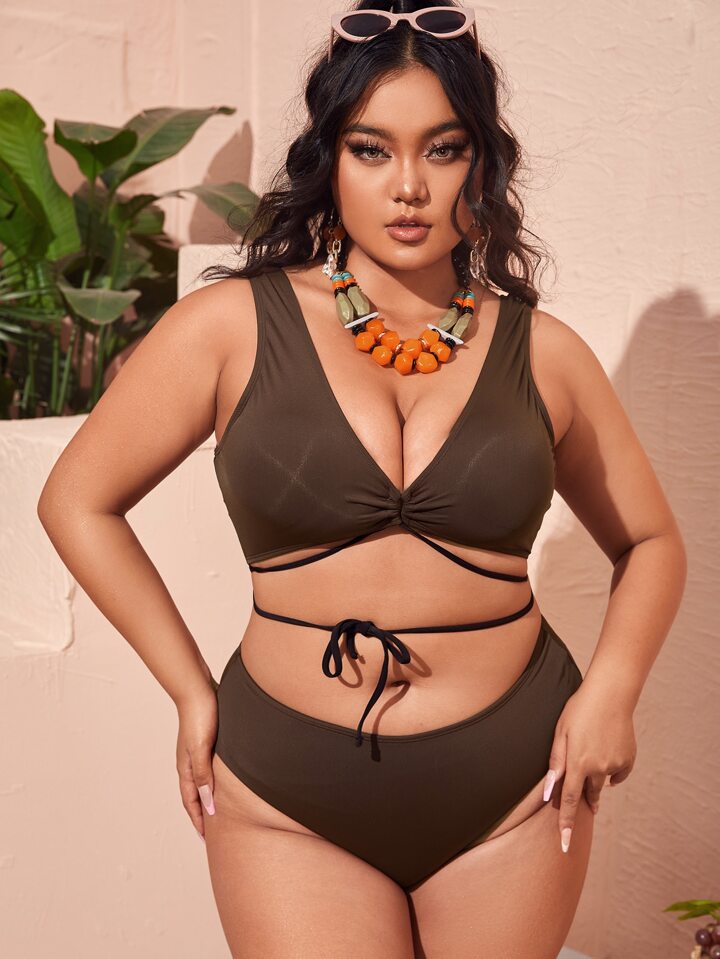 Plus Size Solid Lace Up Bikini Set Summer Beach