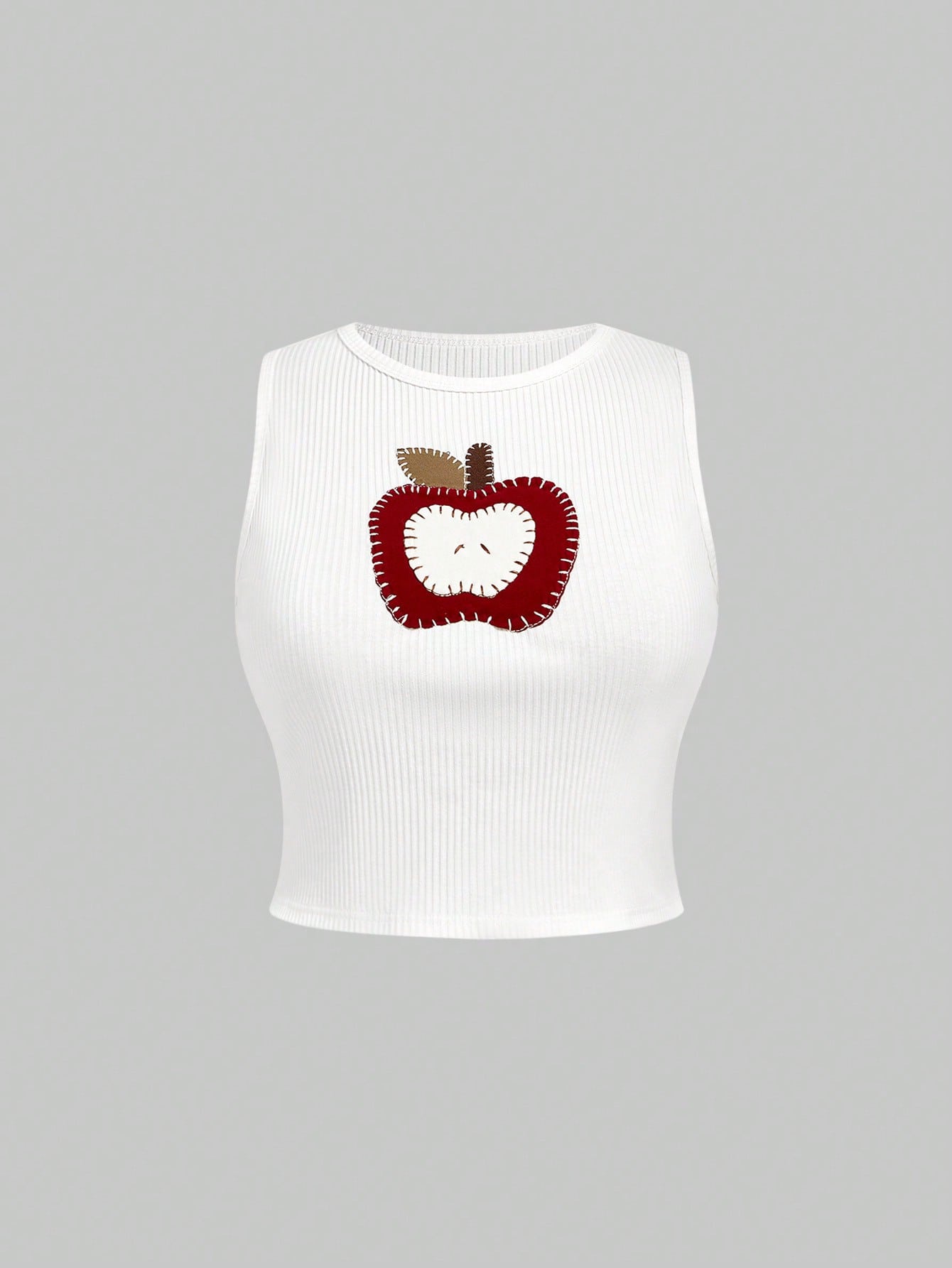 Kawaii Plus Size Spring Cute Countryside Apple Pattern Applique Embroidery Elastic Knit Versatile Tank Top