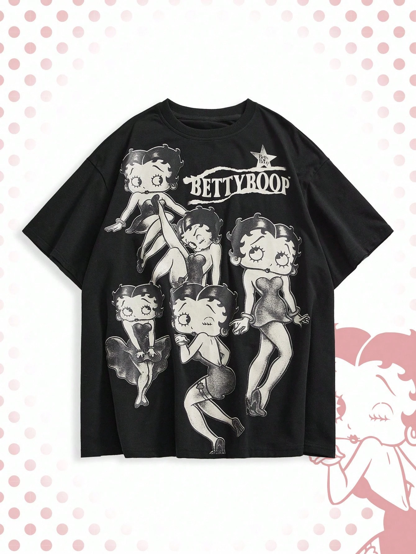 Betty Boop | ROMWE Plus Size Summer Casual Cartoon Pattern Round Neck Short Sleeve T-Shirt,Back To School