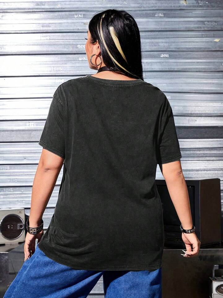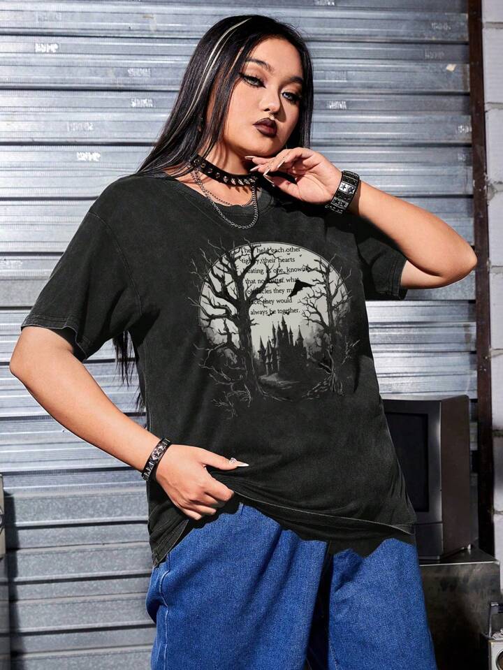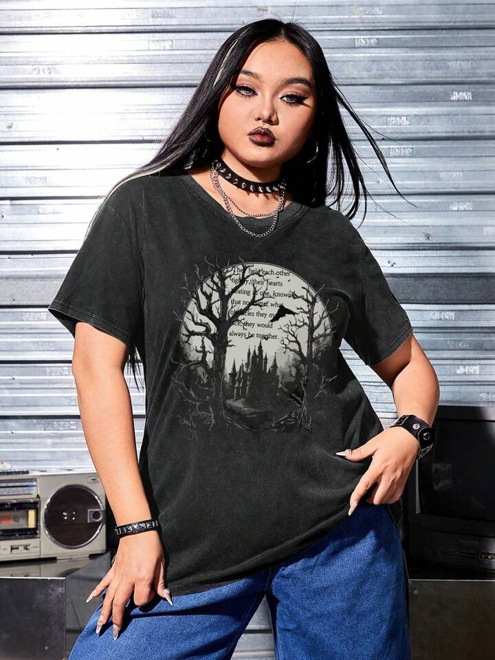 Plus Size Summer Gothic Casual Dark Forest Castle Printed Short Sleeve T-Shirt