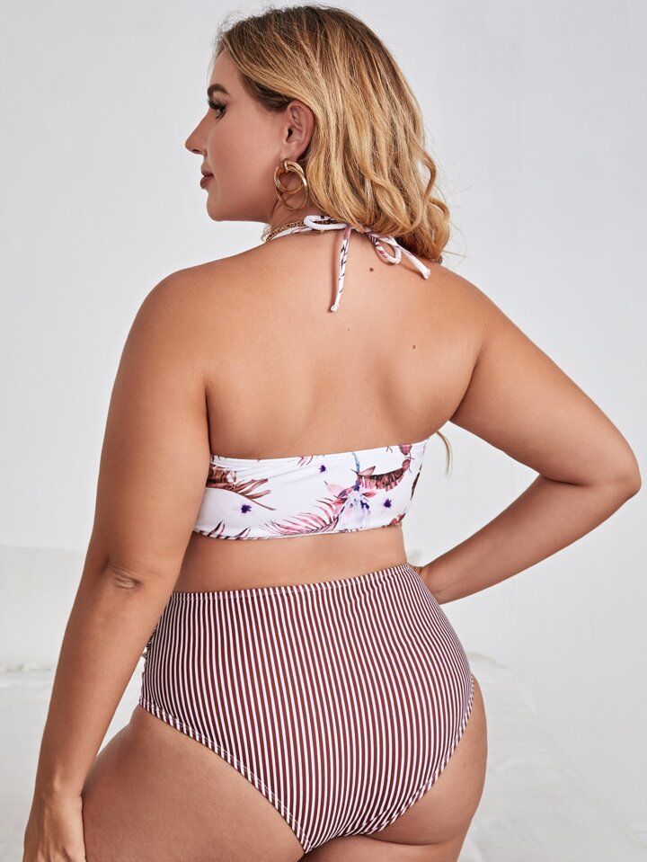 Plus Size Tropical & Striped Halter Bikini Set Summer Beach