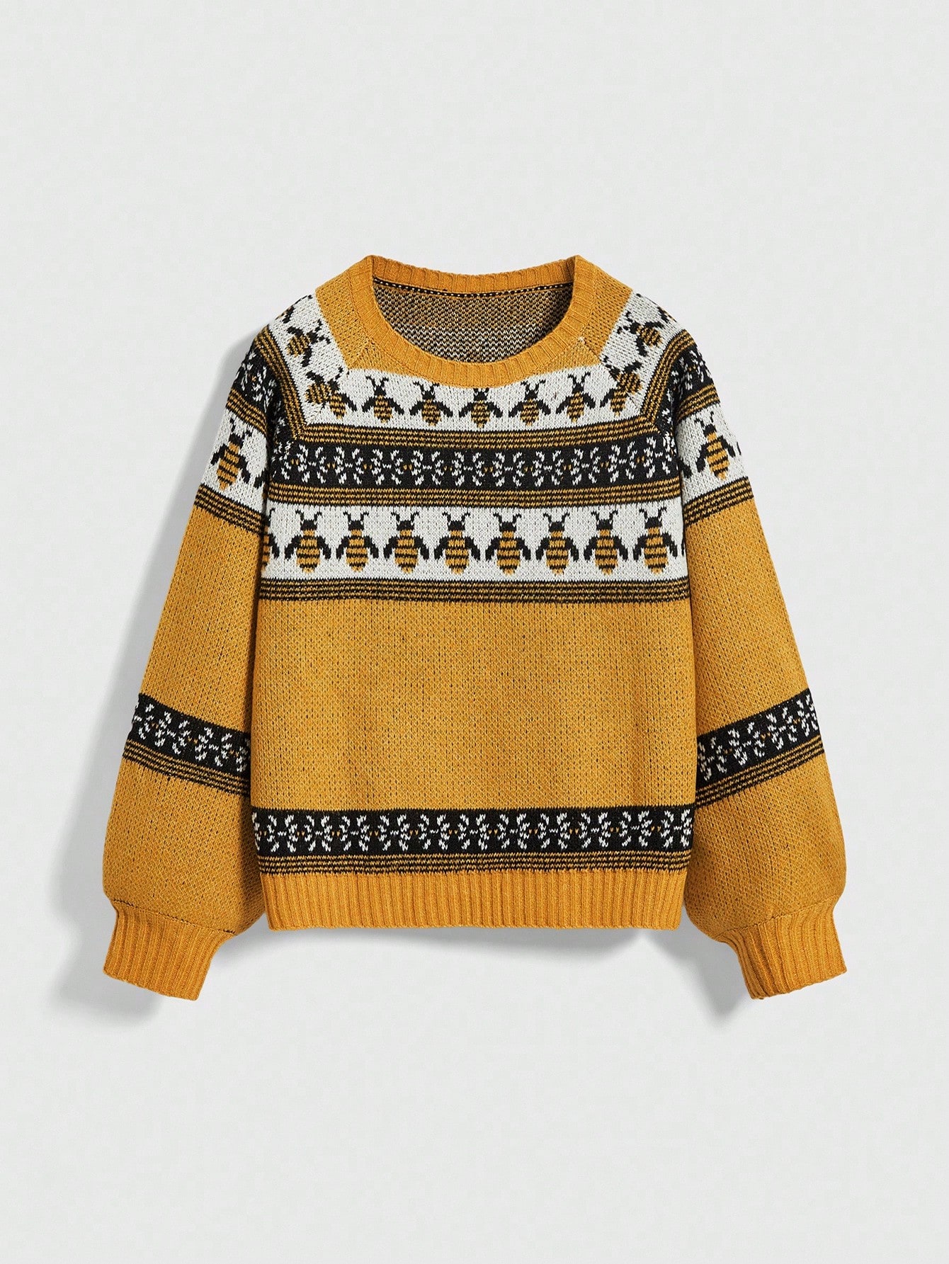 Fairycore Plus Size Vintage Bee Pattern Casual Crew Neck Sweater For Women, Winter