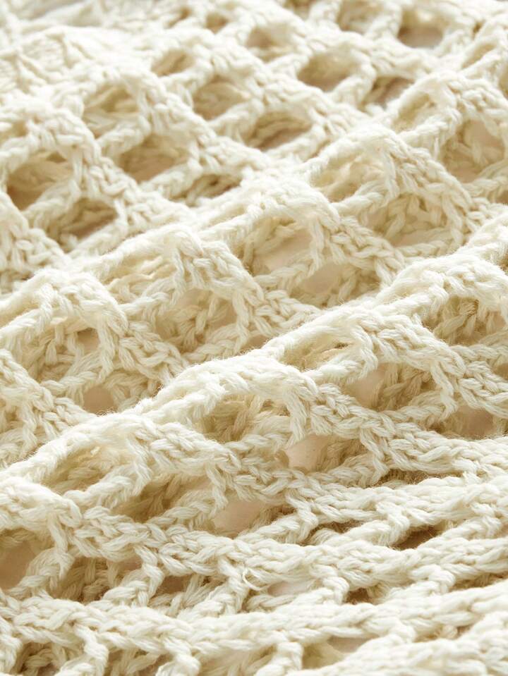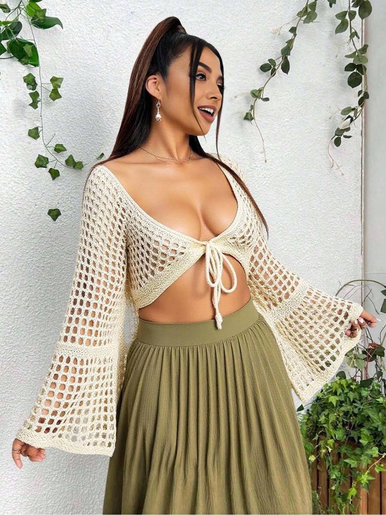 Plus Size Vintage Hollow Out Lace-Up Backless Knitted Cardigan, Vacation Style
