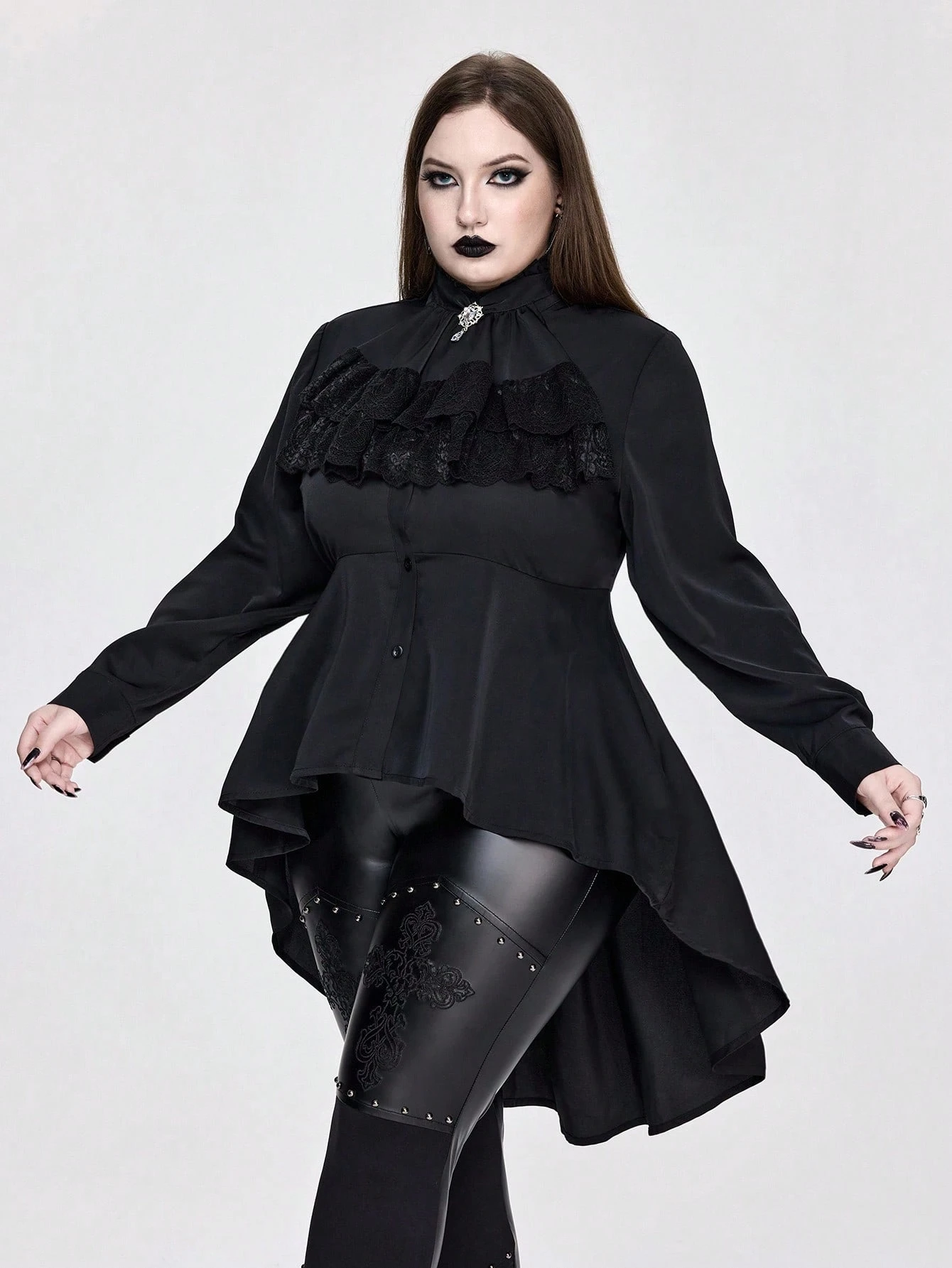 Goth Plus Size Vintage Palace Style Gothic Detachable Ruffle Tie Collar, Baroque Crystal Pendant, Bell Ruffle Sleeve, Waist Tie Women Blouse
