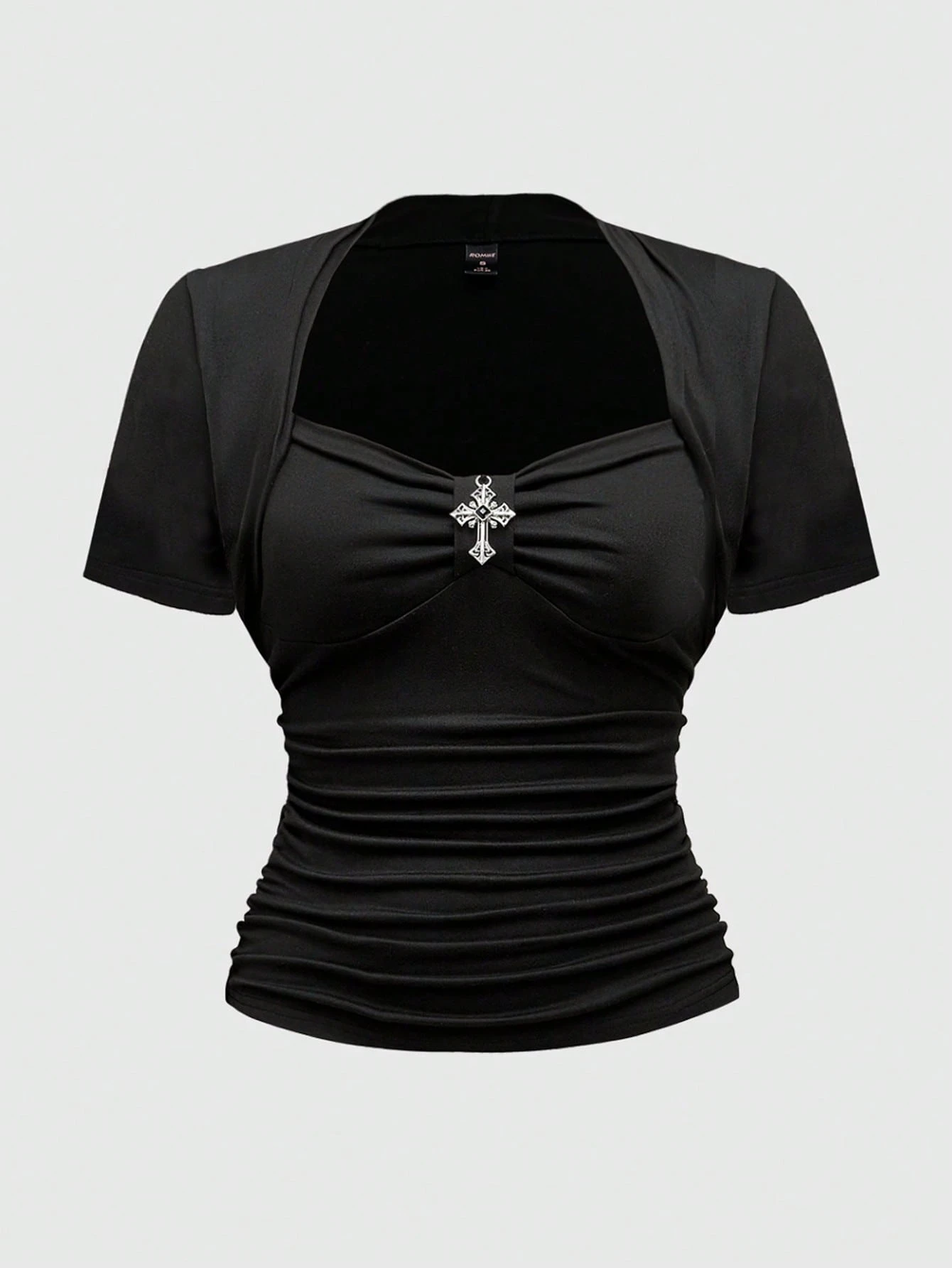 Goth Plus Size Women's Sexy Low-Cut Square Neck Casual Cross Pendant Decor Stretchy Short Sleeve T-Shirt Dress, Black