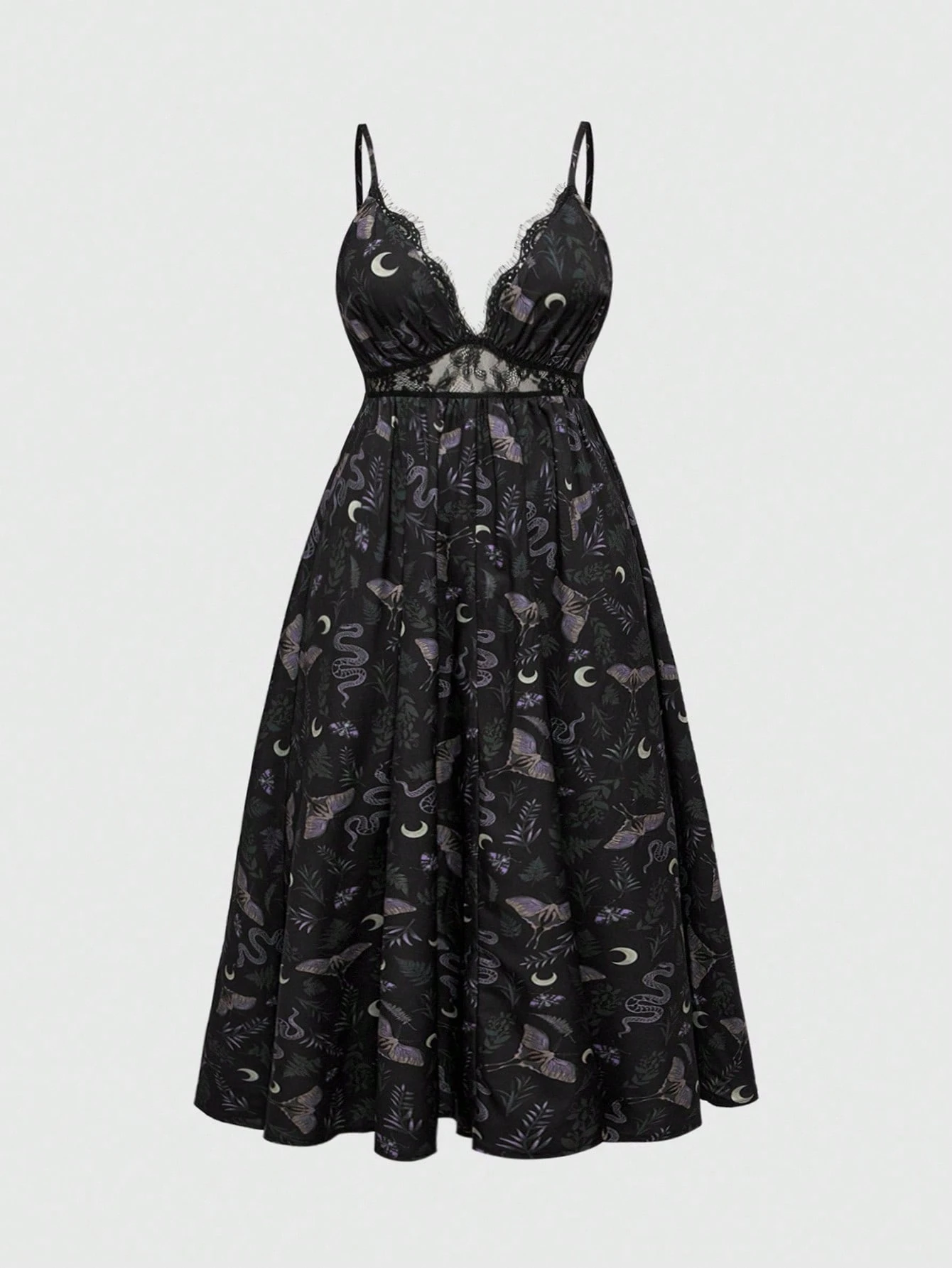 Goth Plus Size Women's Vintage Mysterious Forest Leaf & Moth Moon Print Dress,Homecoming Dress