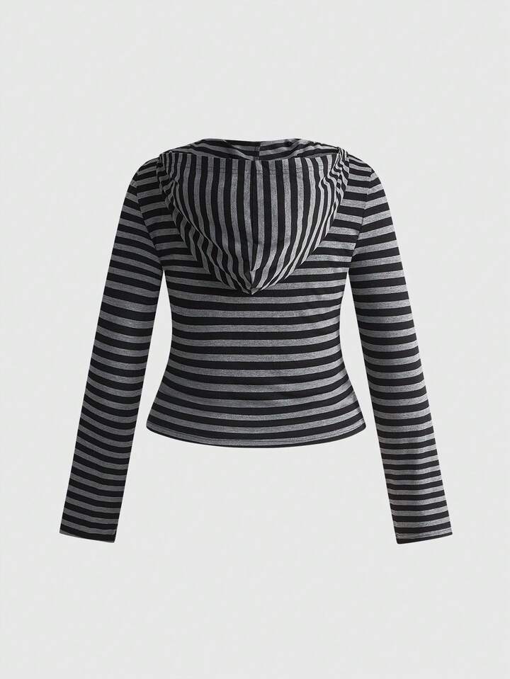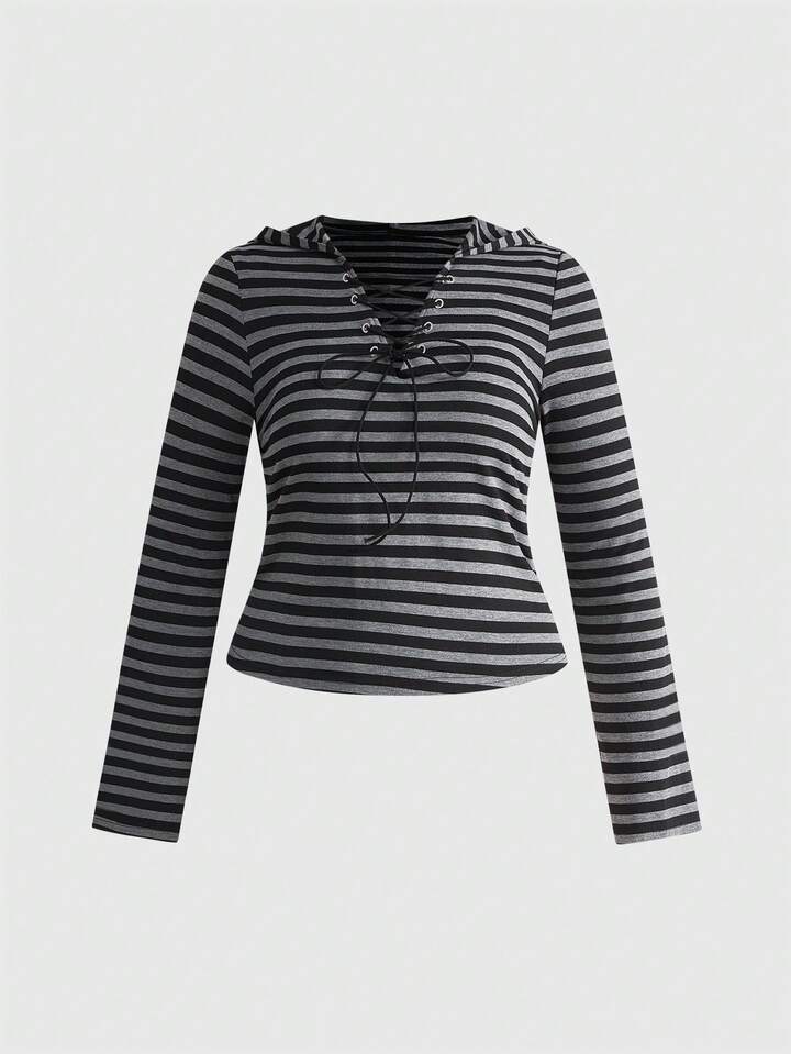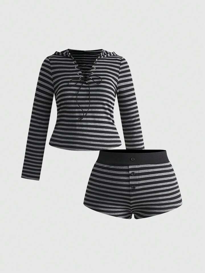 Plus Size Women American Style Black & Gray Striped Eyelet Lace-Up Hoodie And Shorts Casual Set