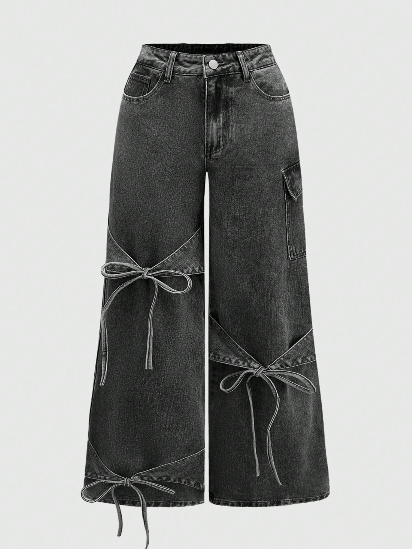 Kawaii Plus Size Women Bowknot Denim Wide Leg Jeans, Versatile
