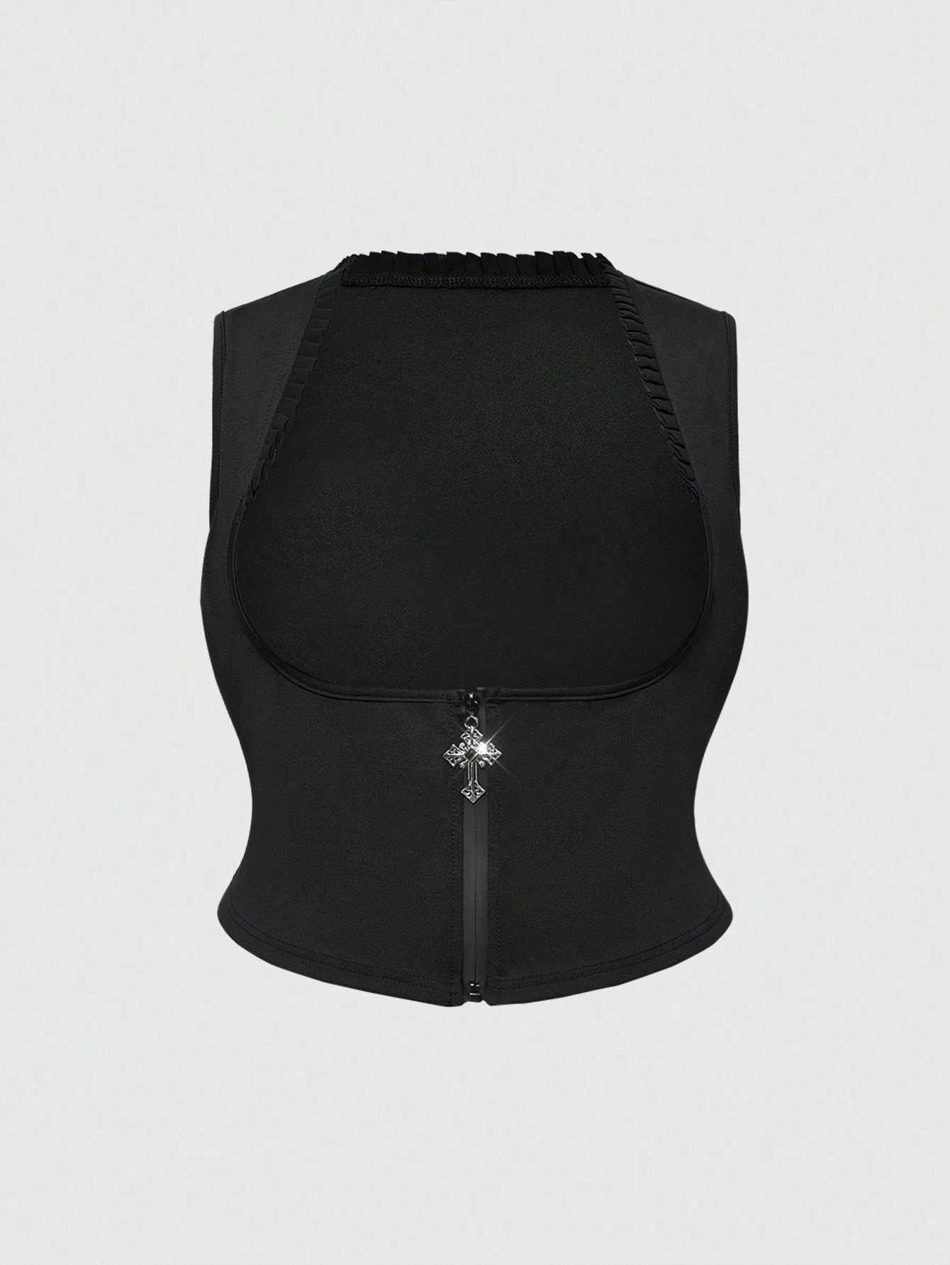 Plus Size Women Gothic Cross Decor Lace Patchwork Vest, Can Be Paired With Shirts, Halloween