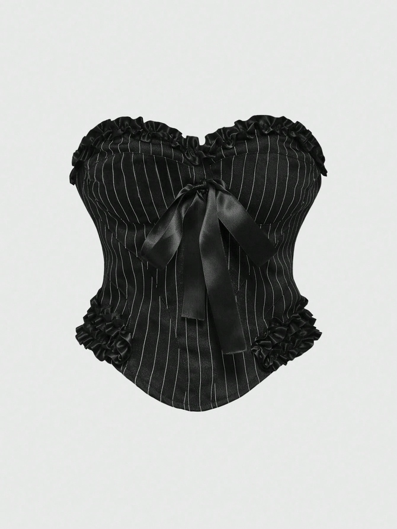 Goth Plus Size Women Gothic Dark Striped Fabric Bow Tie Bandeau Top, Can Be Worn As Layering
