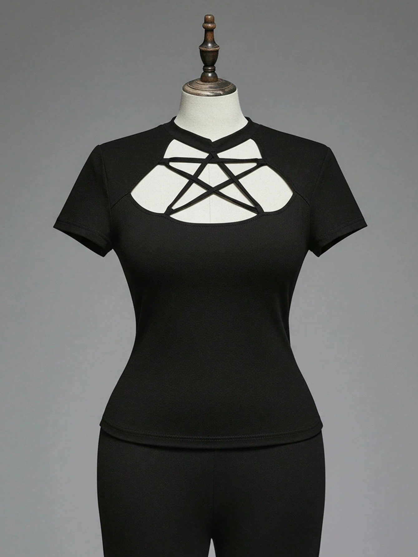 Plus Size Women Gothic Hollow Out Star Lace-Up Front Tight Fit T-Shirt