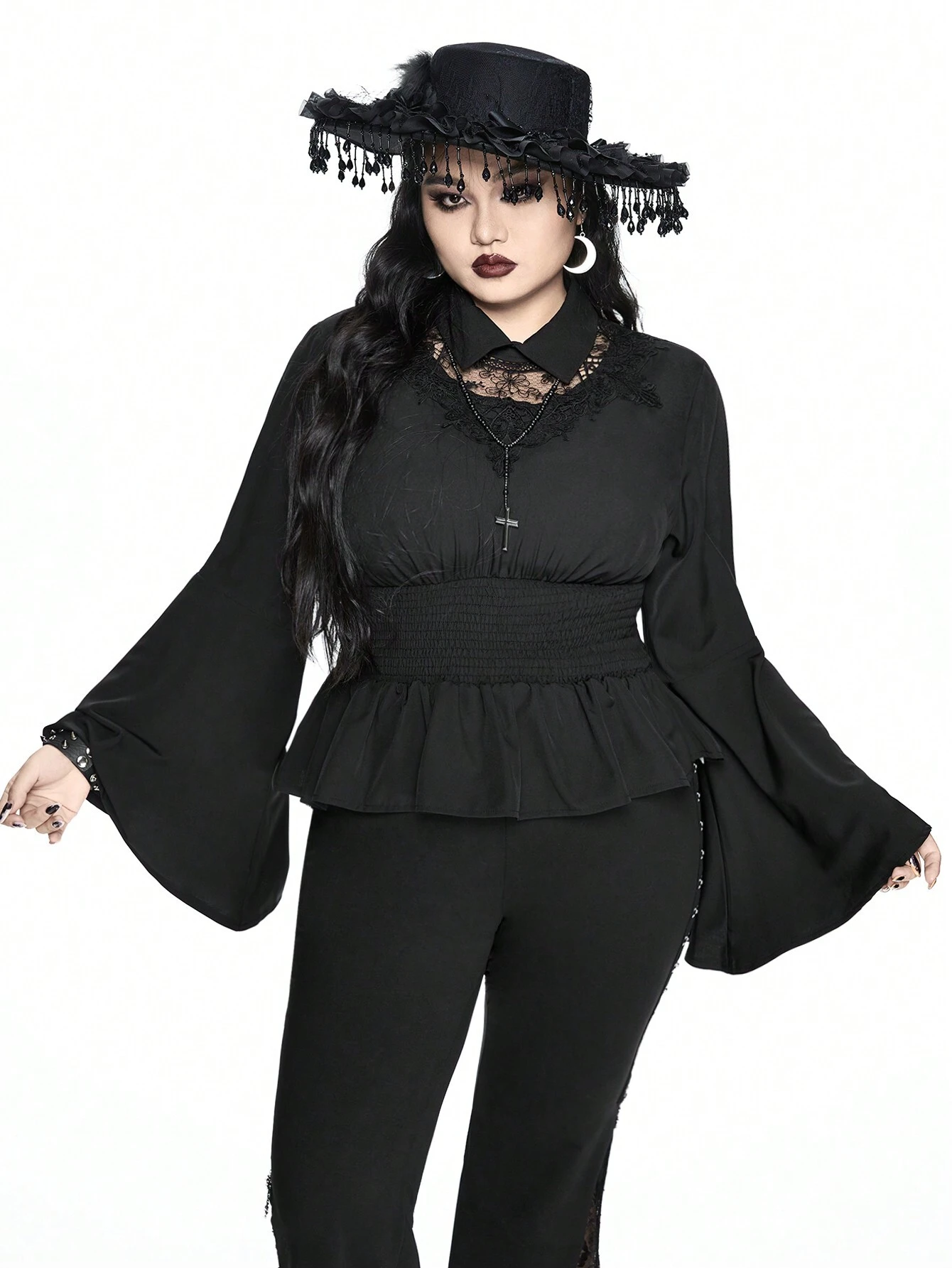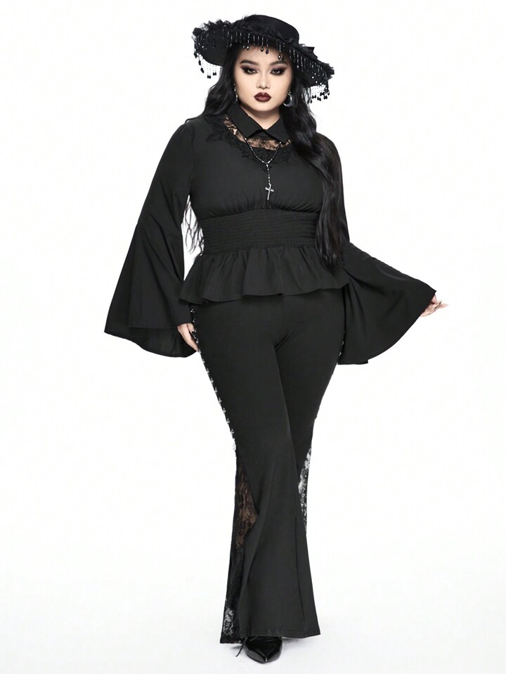 Plus Size Women Gothic Lace Splice Breathable Cinched Waist Button Down Shirt