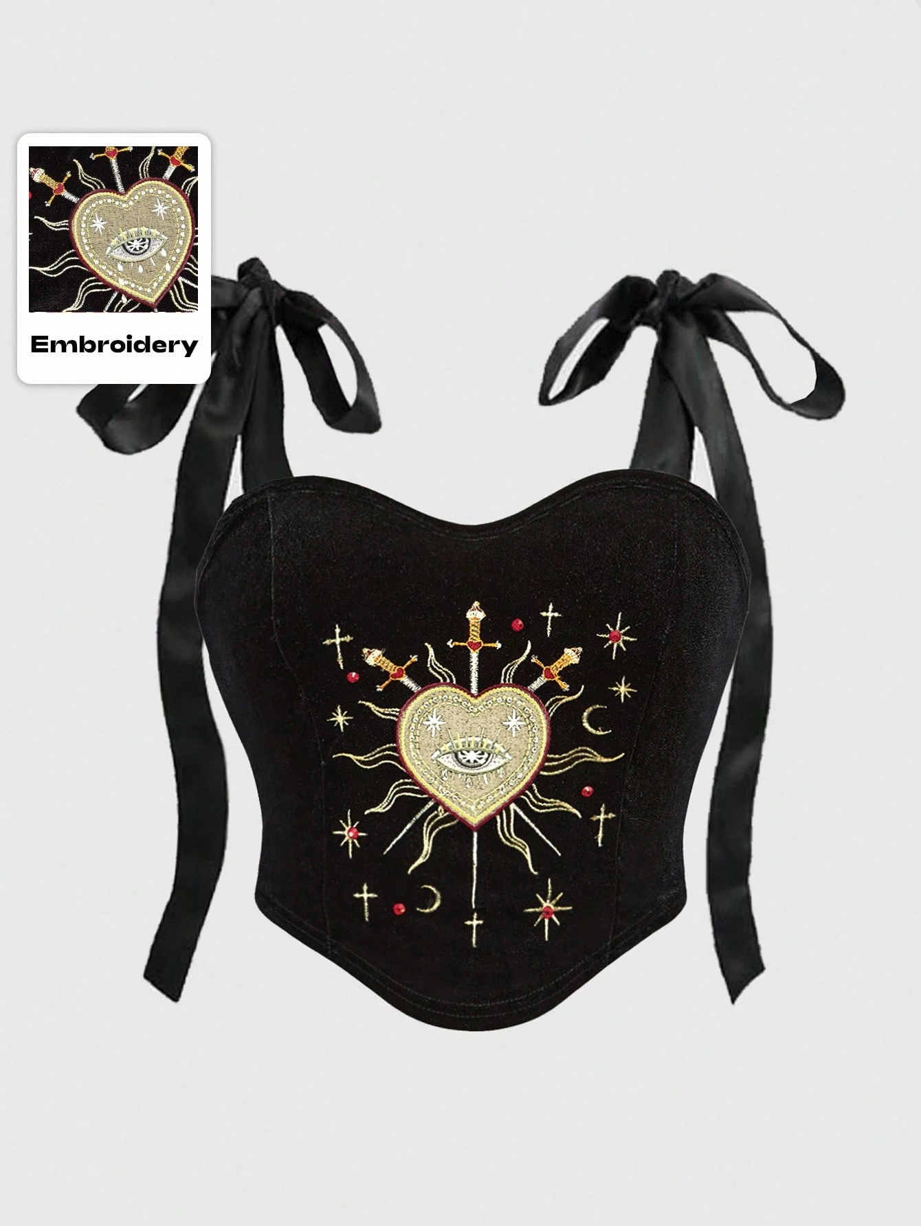 Plus Size Women Gothic Lolita Style Heart Embroidery Rhinestone Crystal Teardrop Star Decor Square Neck Lace-Up Camisole Crop Top