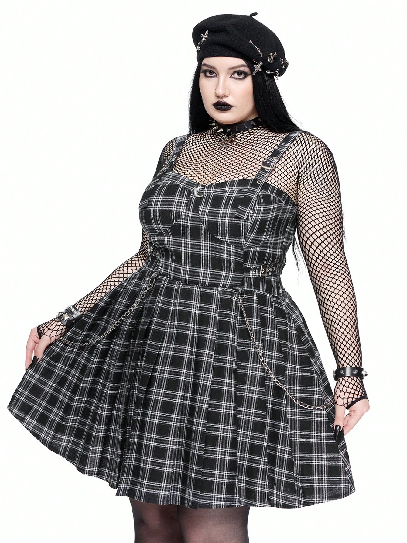Goth Plus Size Women Gothic Plaid Metal Buckle Strap Decor Pleated Jumper Dress, Back To School