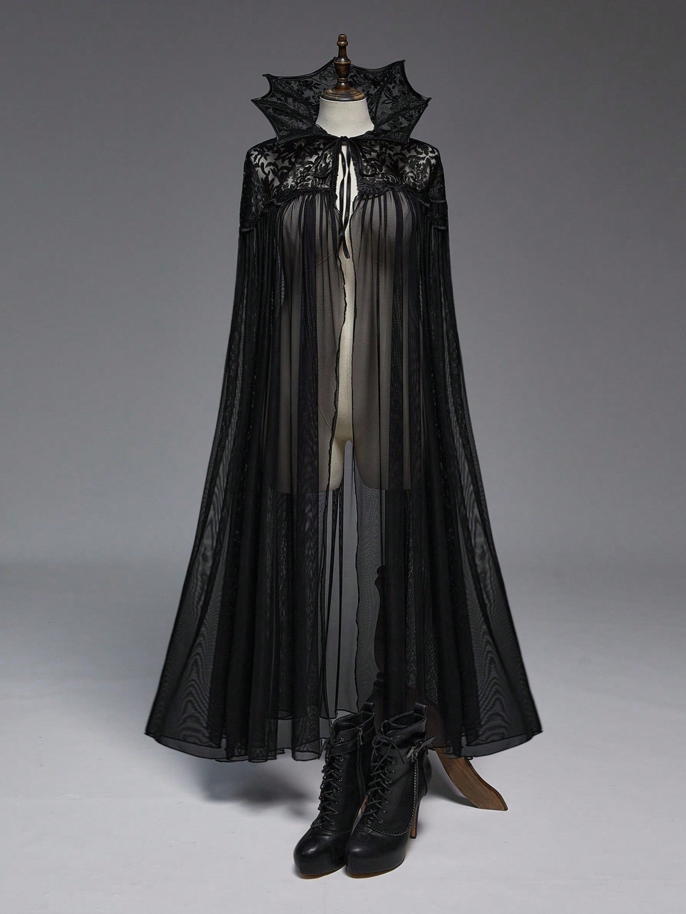 EDITION Plus Size Women Gothic Vampire Bat Collar Lace Mesh Patchwork Loose Cloak Shawl Blouse, Halloween