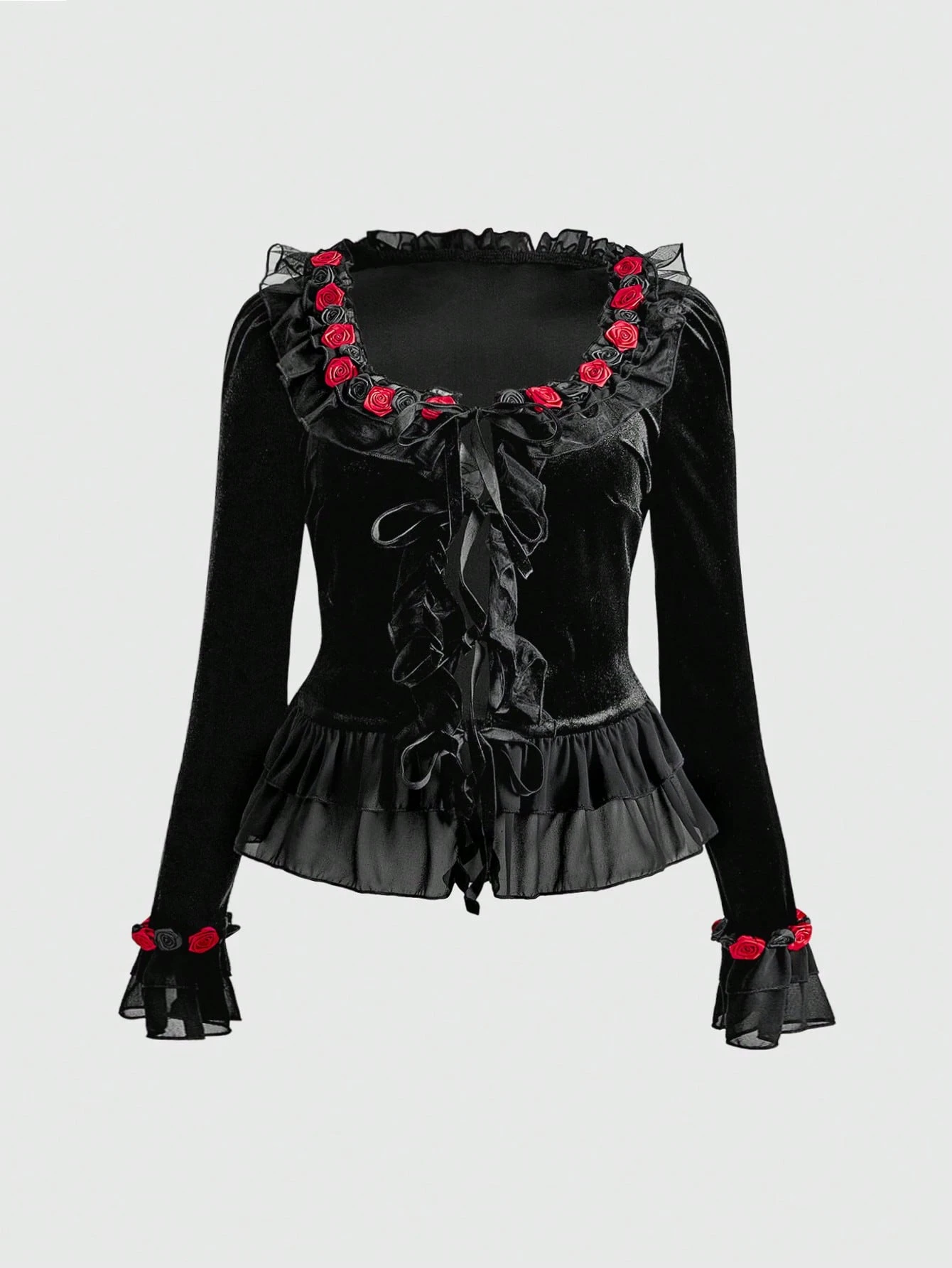 Plus Size Women Gothic Vintage Luxurious Red Rose Ruffle Flare Sleeve Velvet Blouse, Autumn/Winter Gothic Elegant Retro Luxurious Plus Size Women Tie-Up Velvet Shirt Blouse Jacket