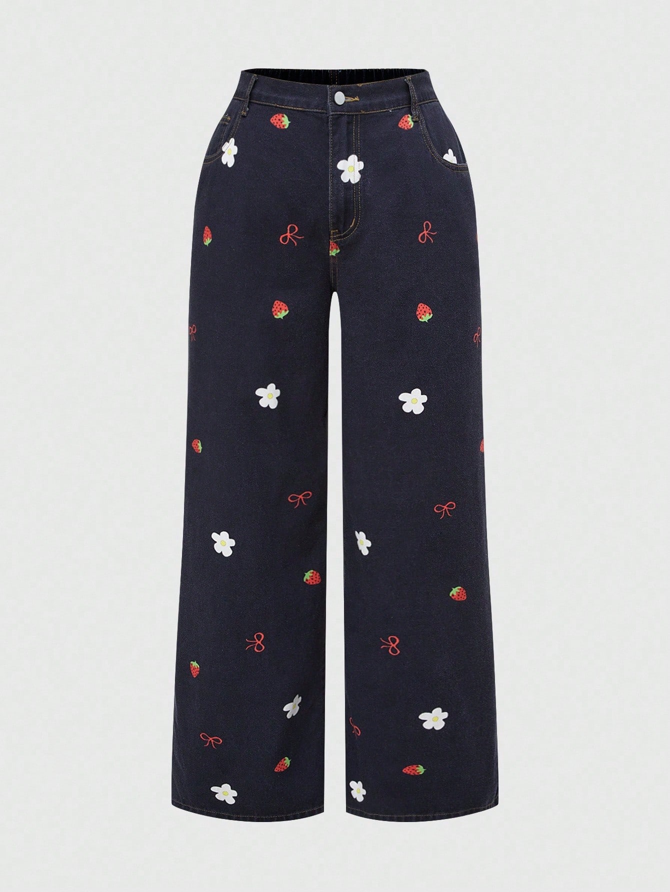 Kawaii Plus Size Women Strawberry Bow Flower Decor Denim Jeans