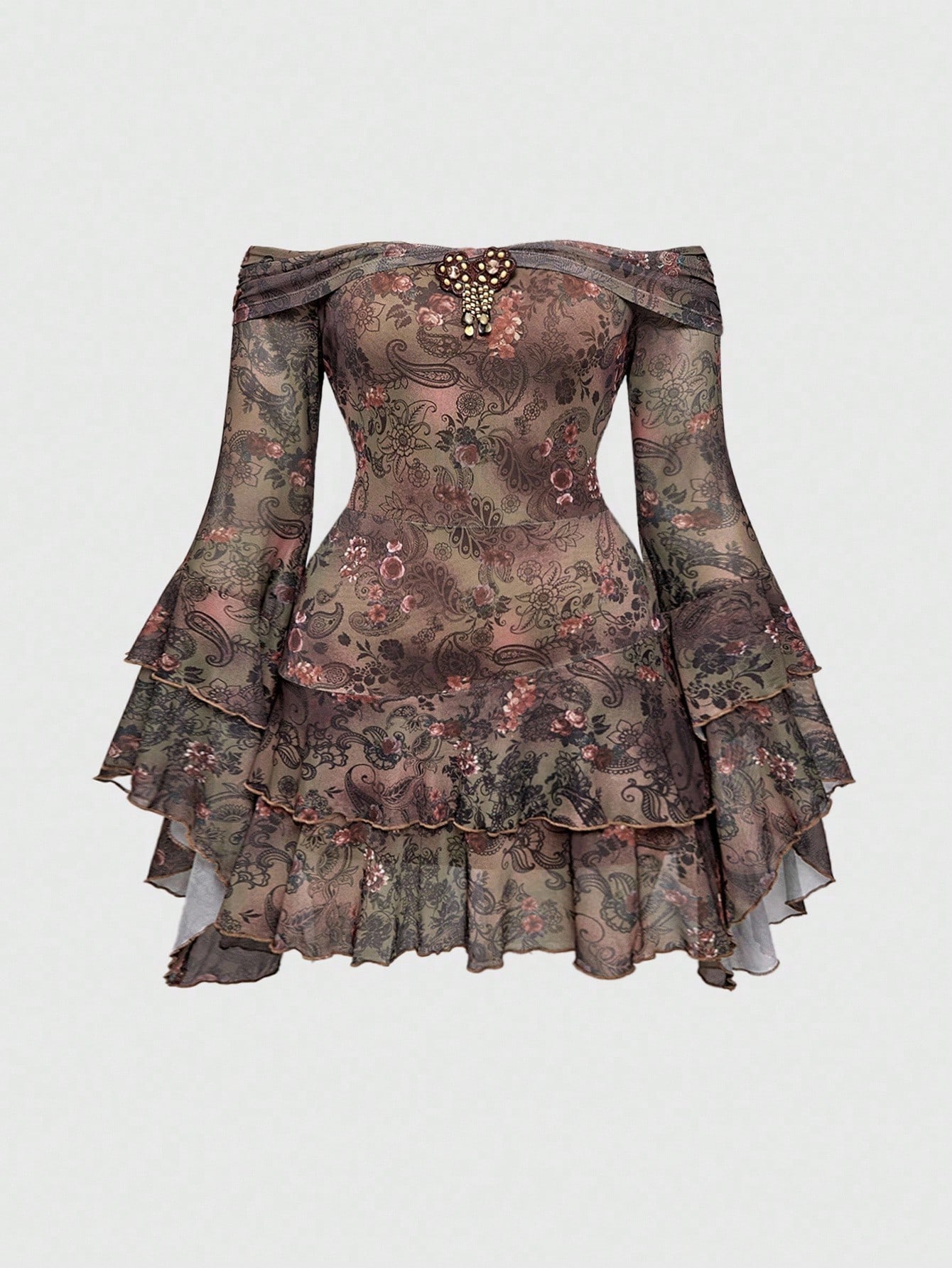 Plus Size Women Vintage Hippie Ruffled Ribbon Lace Paisley Print Off Shoulder Mini Flare Sleeve Dress