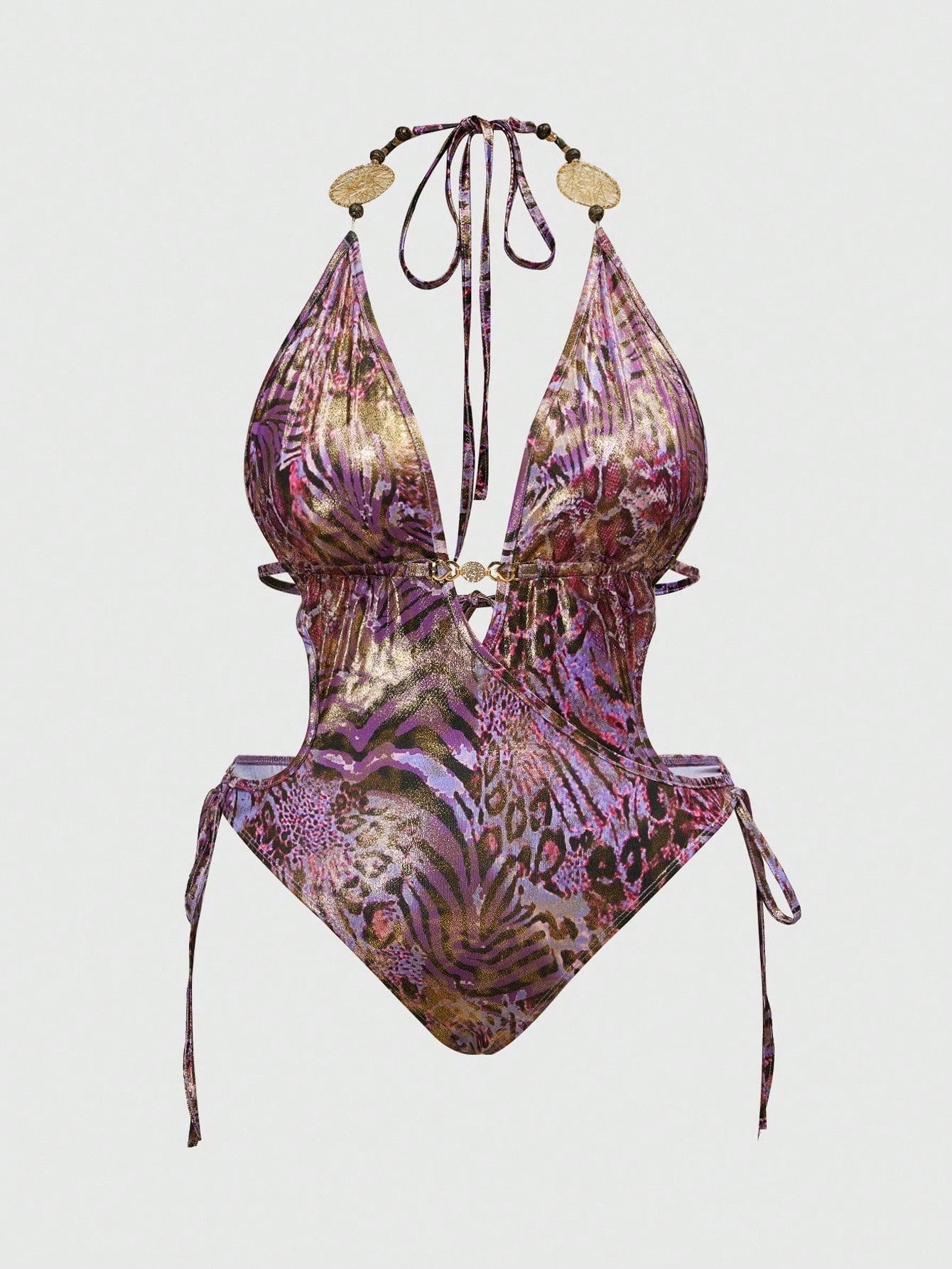 Hippie Plus Size Women Y2K Retro Sexy Leopard Print Metallic Decor Bodysuit, Party Style