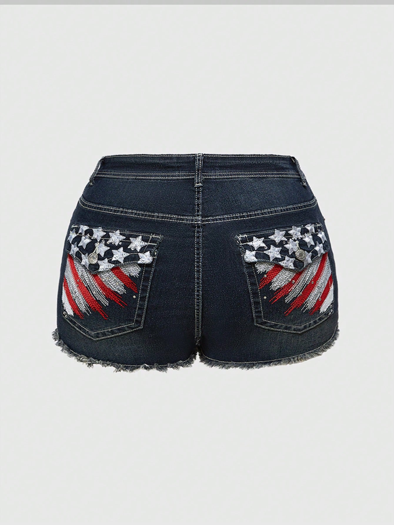J-Fashion Plus Size Women Y2K Vintage Streetwear Low-Rise Slim-Fit Denim Shorts With American Flag Embroidery,4th Of July