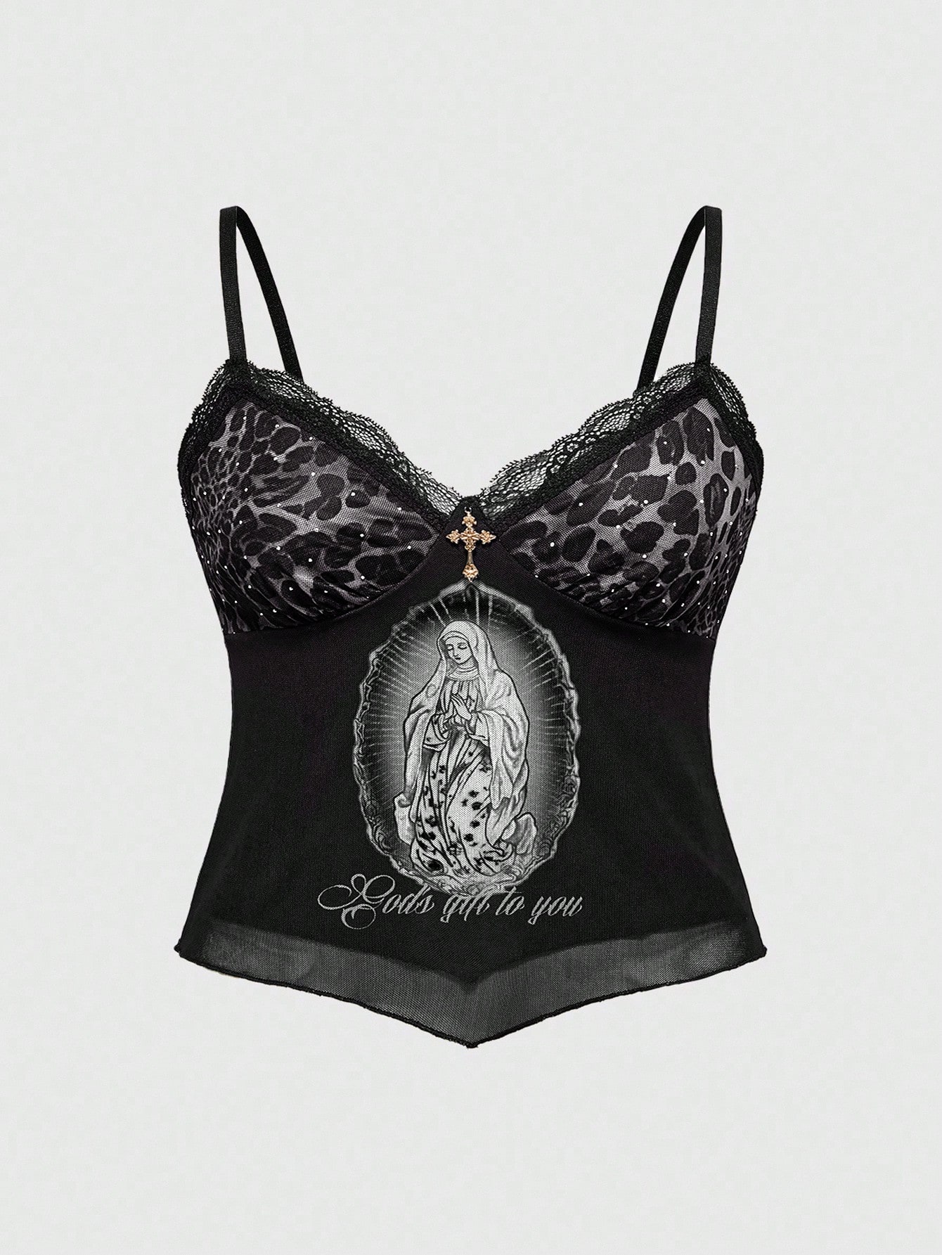 Fairycore Plus Size Y2K Saint Mary Patchwork Leopard Print Rhinestone Lace Camisole