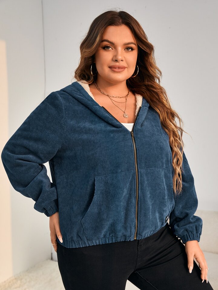 Plus Slant Pocket Hooded Teddy Lined Corduroy Jacket