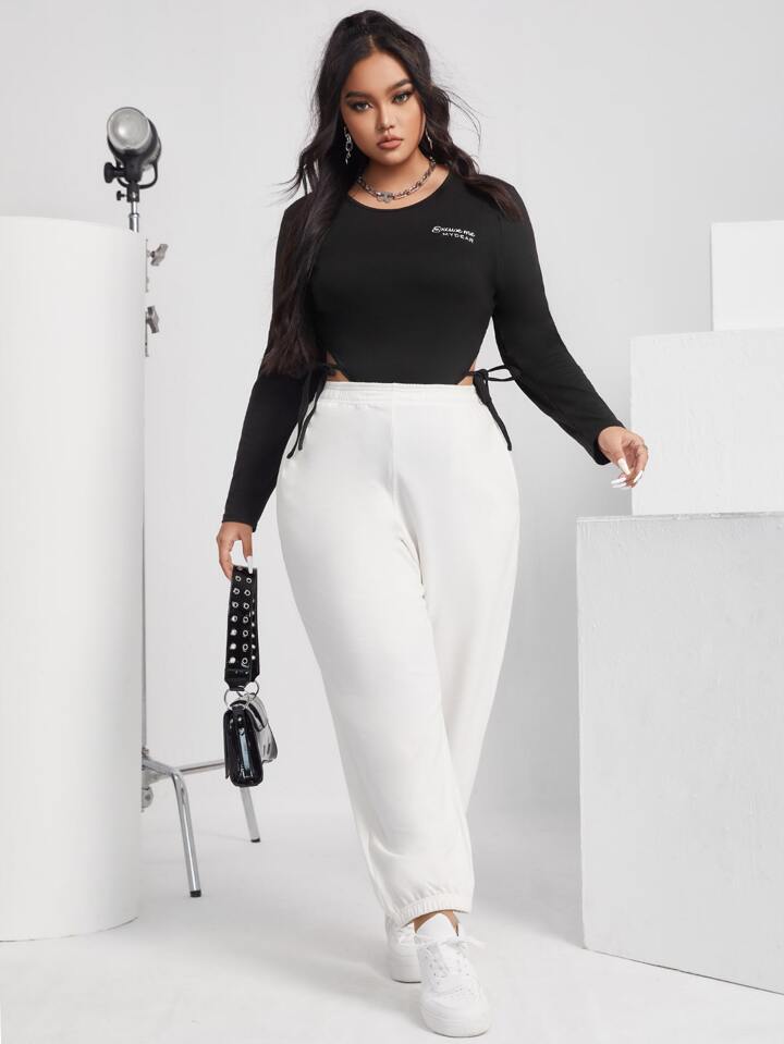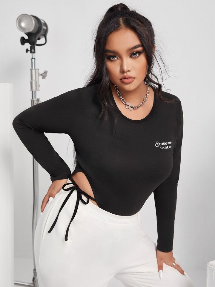 Plus Slogan Graphic Tie Side Cut Out Bodysuit