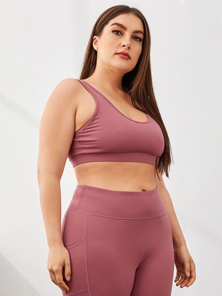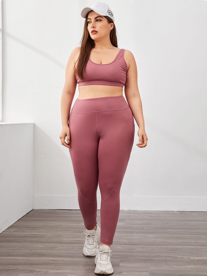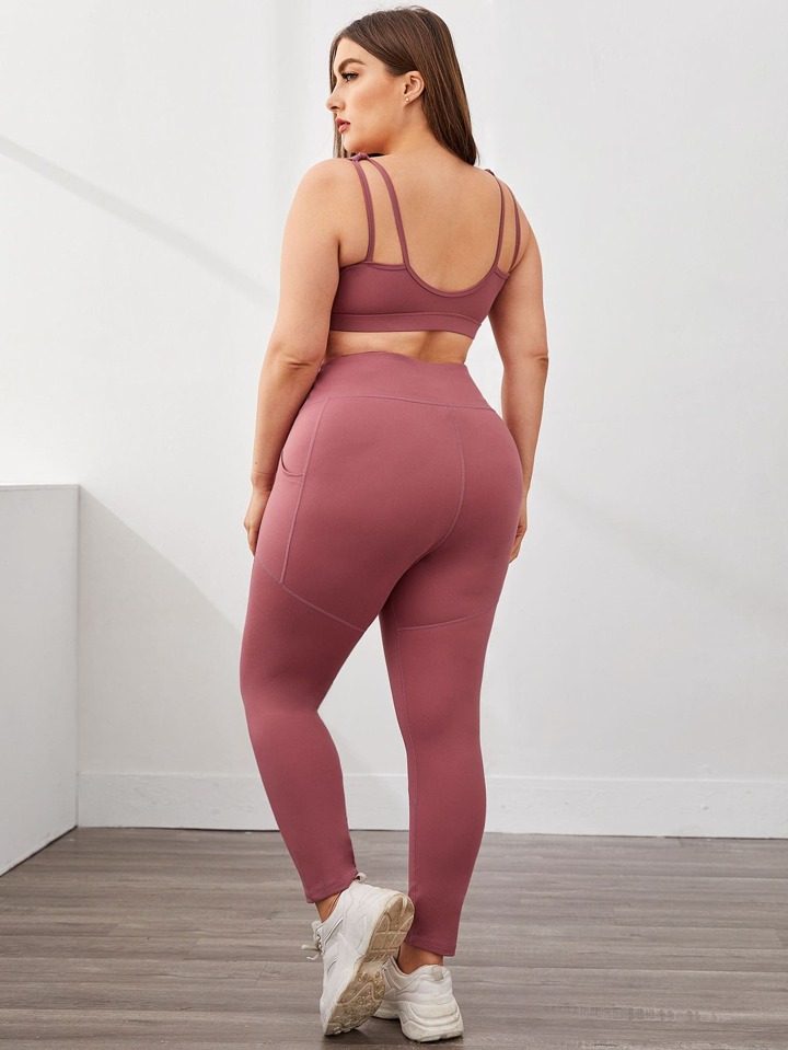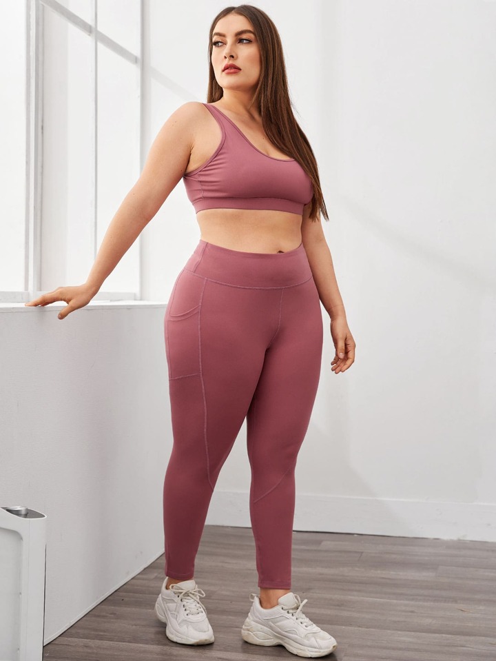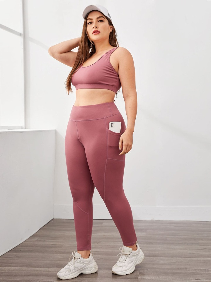 Plus Solid Sports Bra With Pocket Side Wide Band Waist Leggings