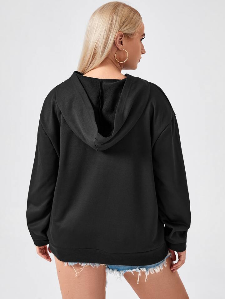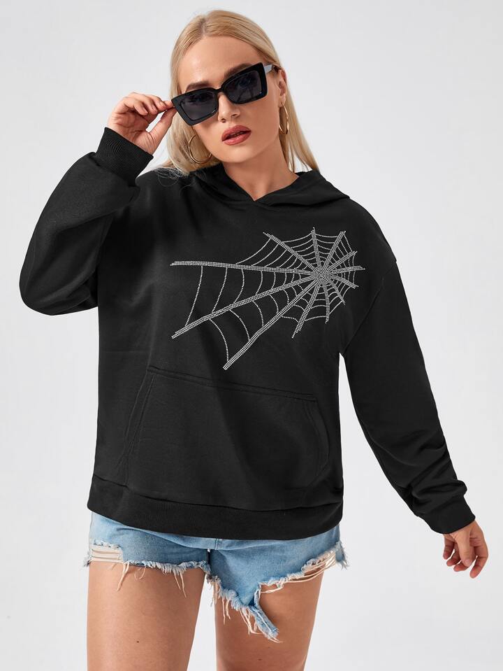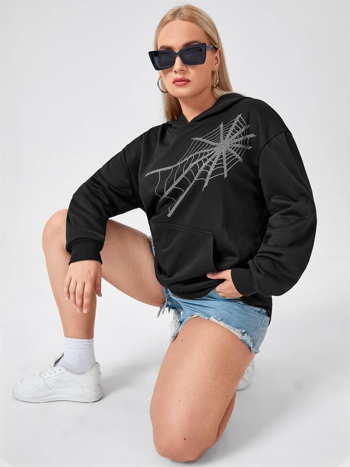 Plus Spider Web Rhinestone Hooded Sweatshirt