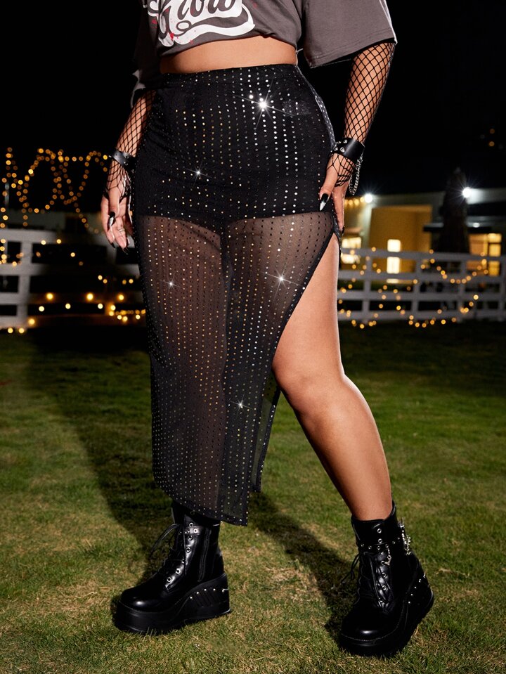 Plus Split Thigh Sequin Mesh Skirt Without Panty