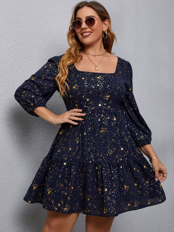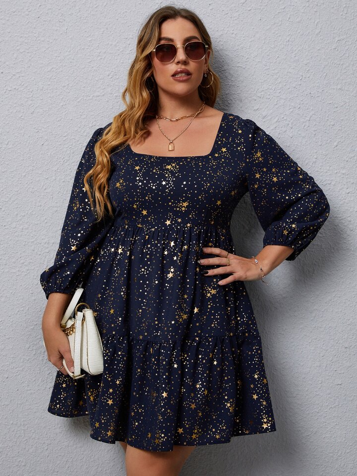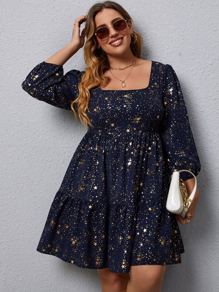 Plus Star Print Bishop Sleeve Ruffle Hem Dress