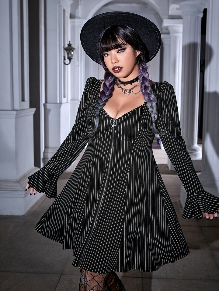 Plus Striped Print Flounce Sleeve Zip Up Dress