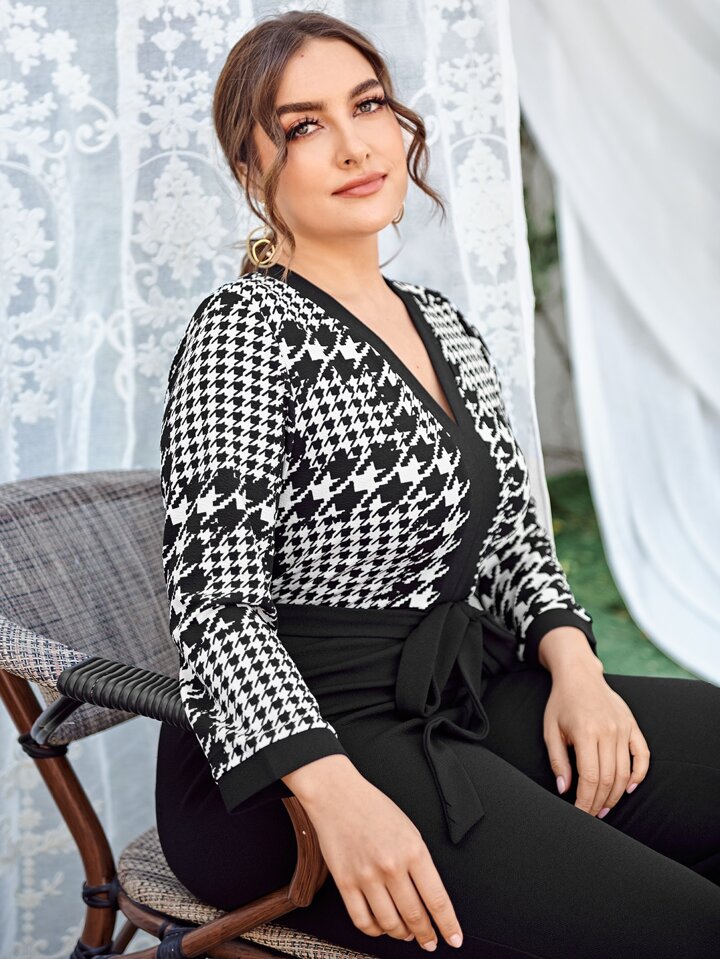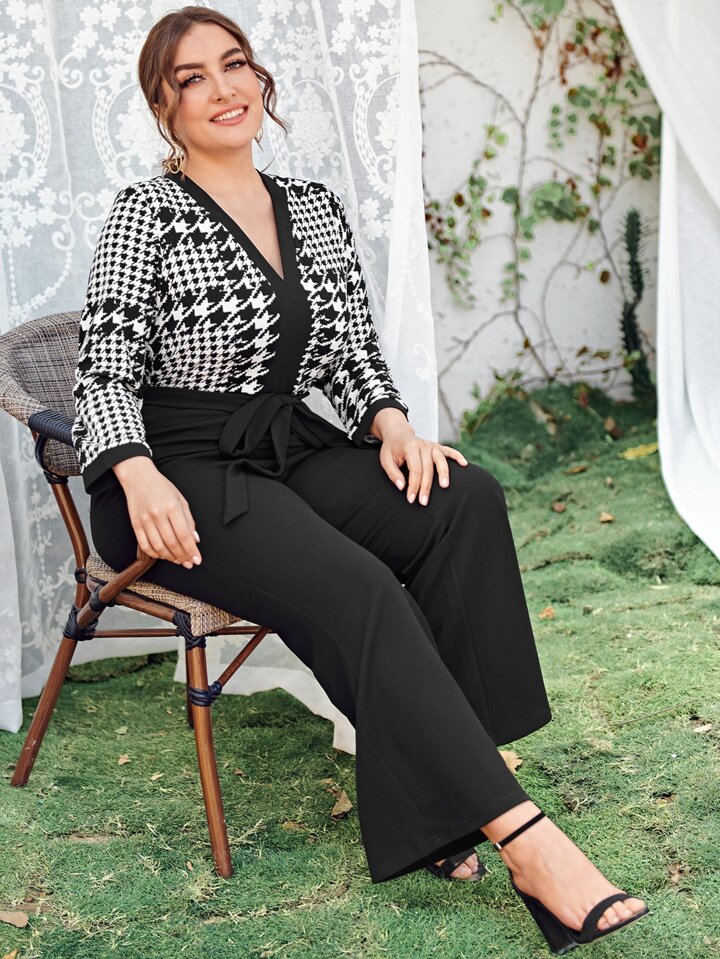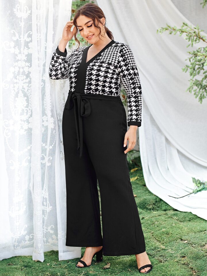 Plus V-neck Houndstooth Bodice Self Belted Jumpsuit