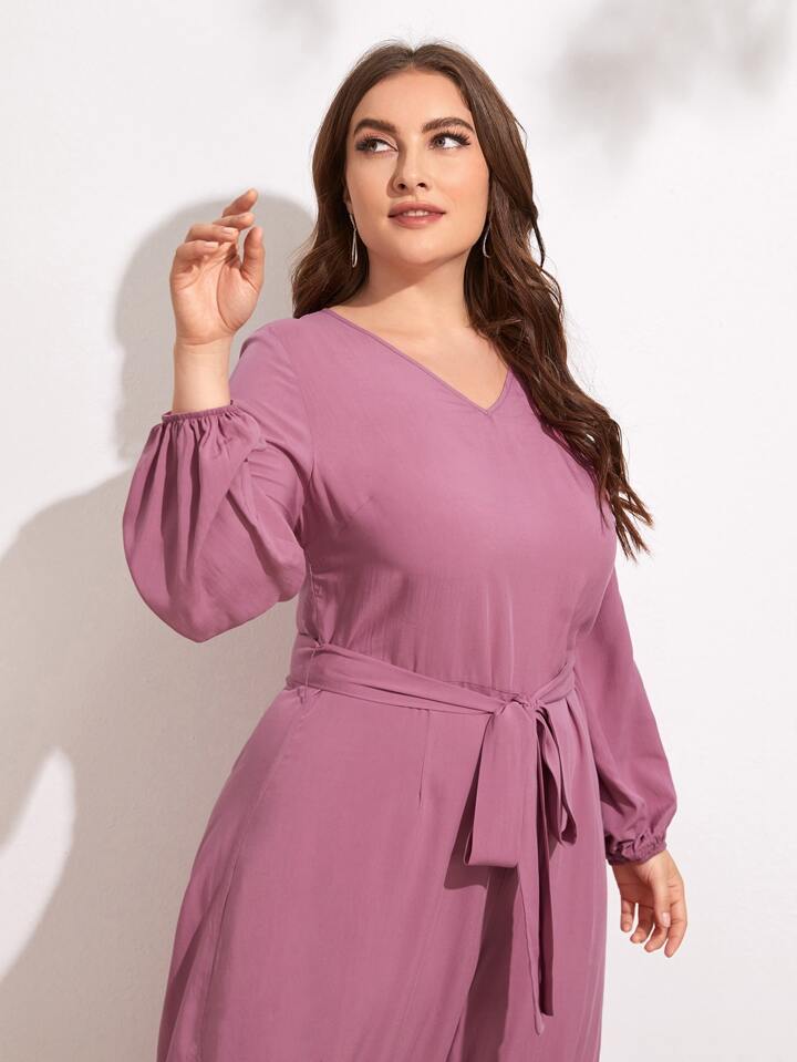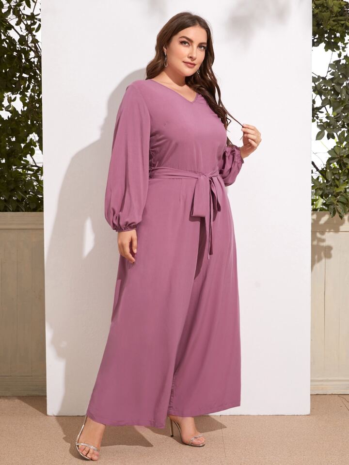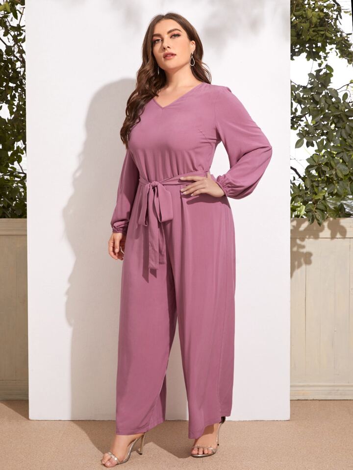 Plus V-neck Lantern Sleeve Belted Palazzo Jumpsuit