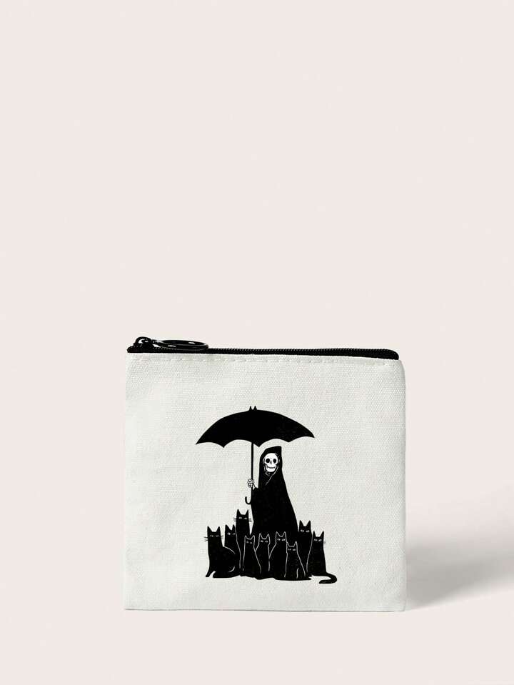 Ppmid Polyester Coin Purse Cartoon Cat & Skull Pattern Zipper