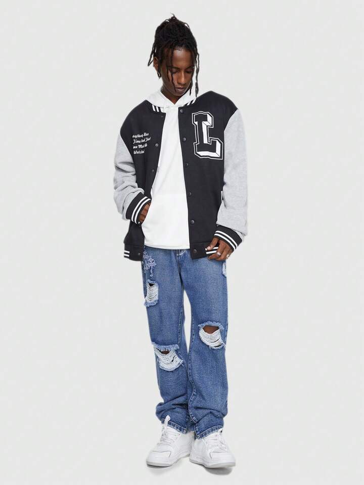 Prep Guys Slogan Graphic Striped Trim Colorblock Varsity Jacket