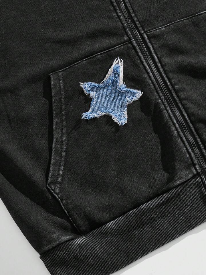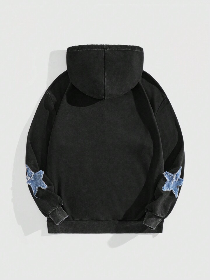 Prep Men's Autumn Star Patch Zipper Stand Collar Drawstring Hoodie Sweatshirt