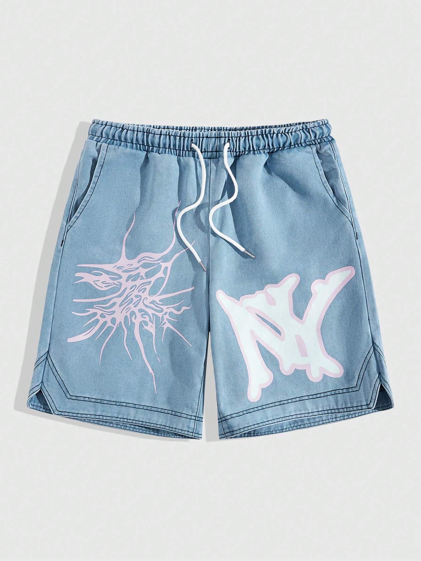 Prep Men's Drawstring Waist Denim Shorts With Letter Print For Casual Occasions, Spring And Summer
