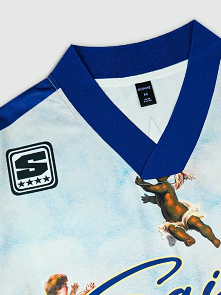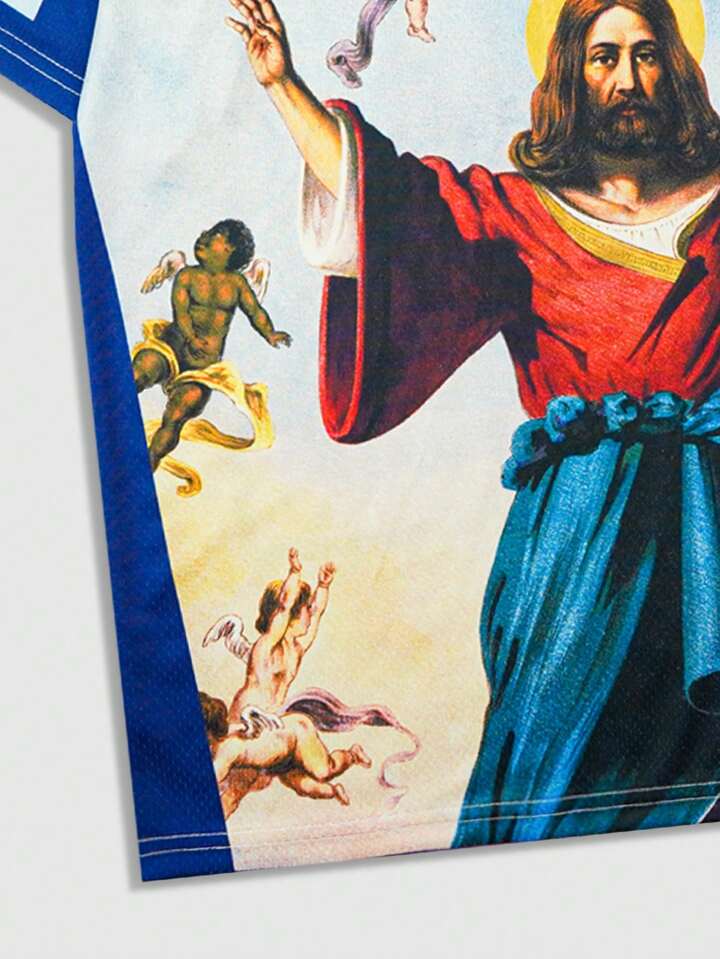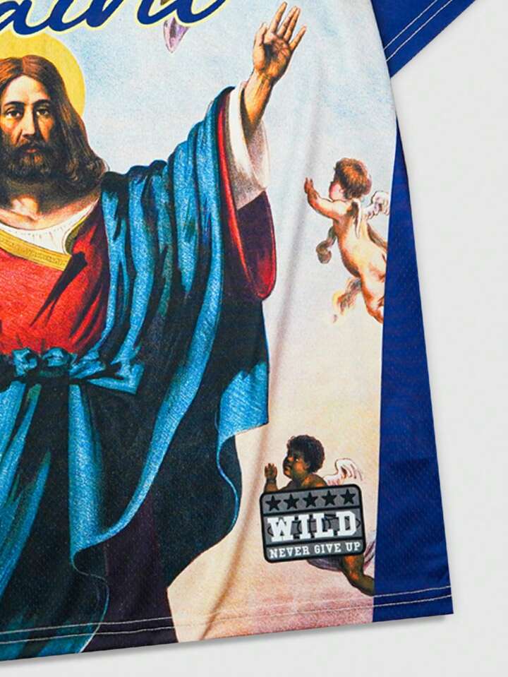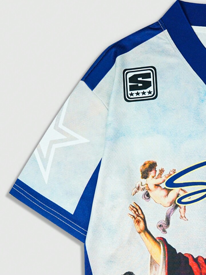 Prep Men's Jesus Image Print Short Sleeve V-Neck Football Jersey Style T-Shirt, Minimalist Fashion Casual Everyday Wear