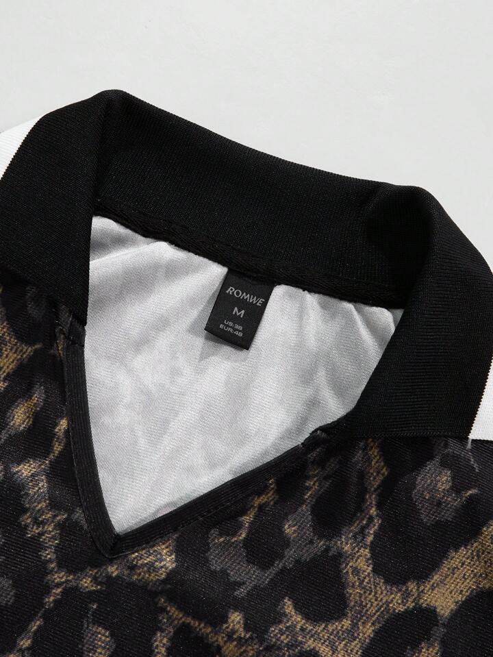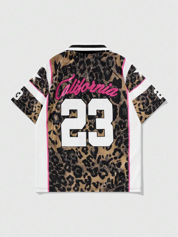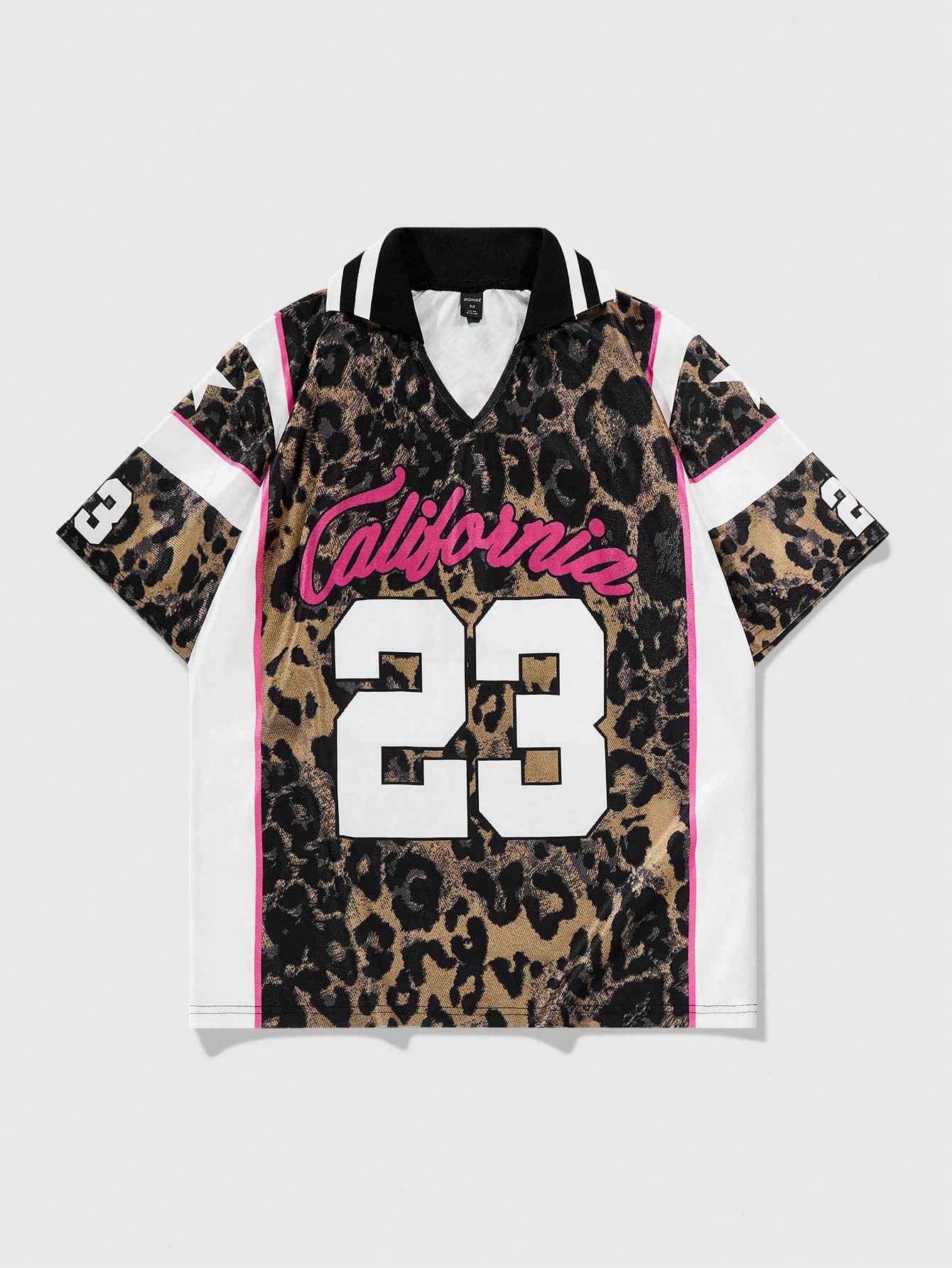 Prep Men's Leopard Print Letter Pattern Polo Football Jersey Style Shirt, Suitable For Everyday Wear, Spring/Summer