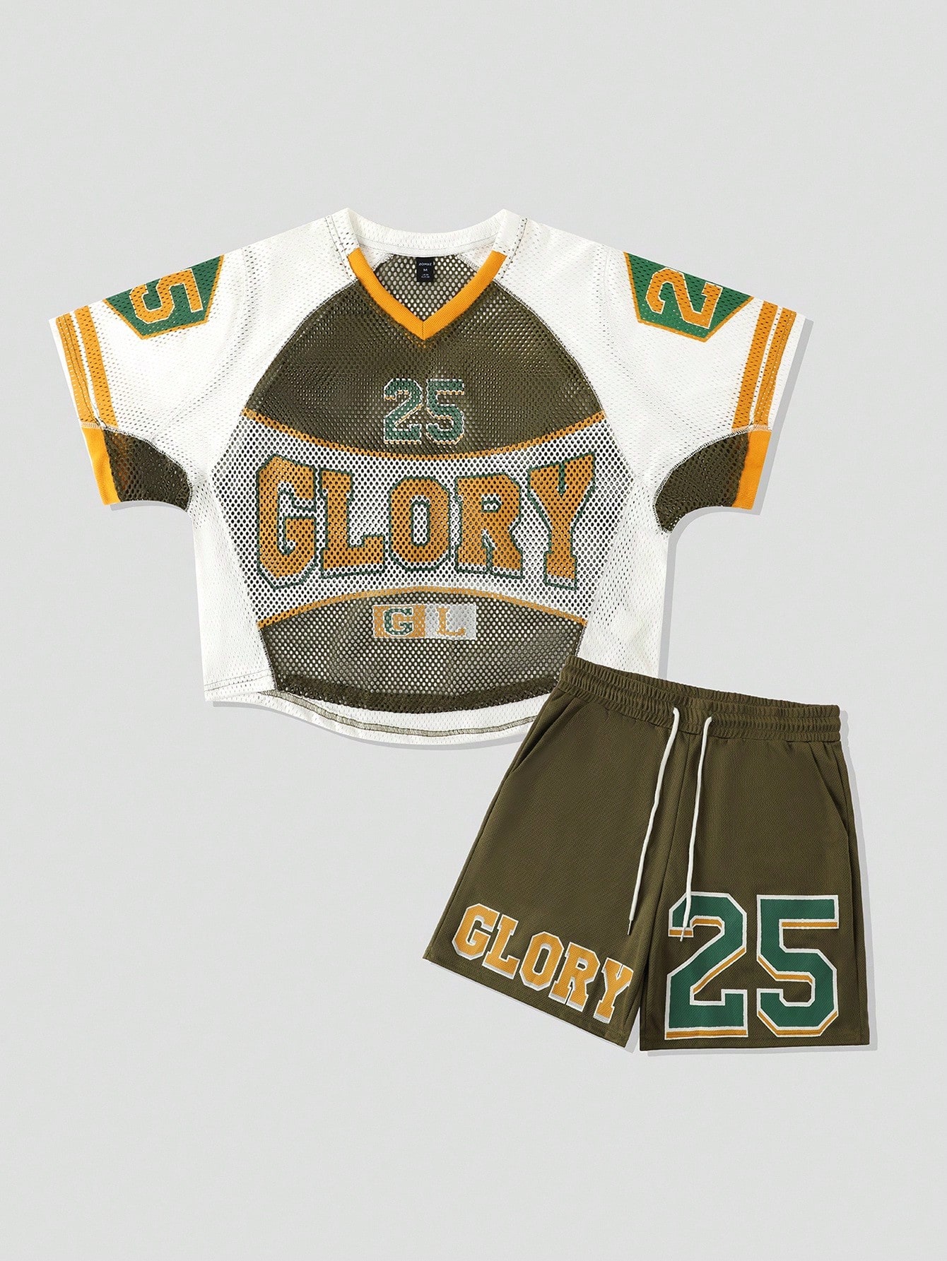 Prep Men's Mesh Patchwork Letter Print Short Sleeve Sports T-Shirt And Drawstring Waist Shorts Set