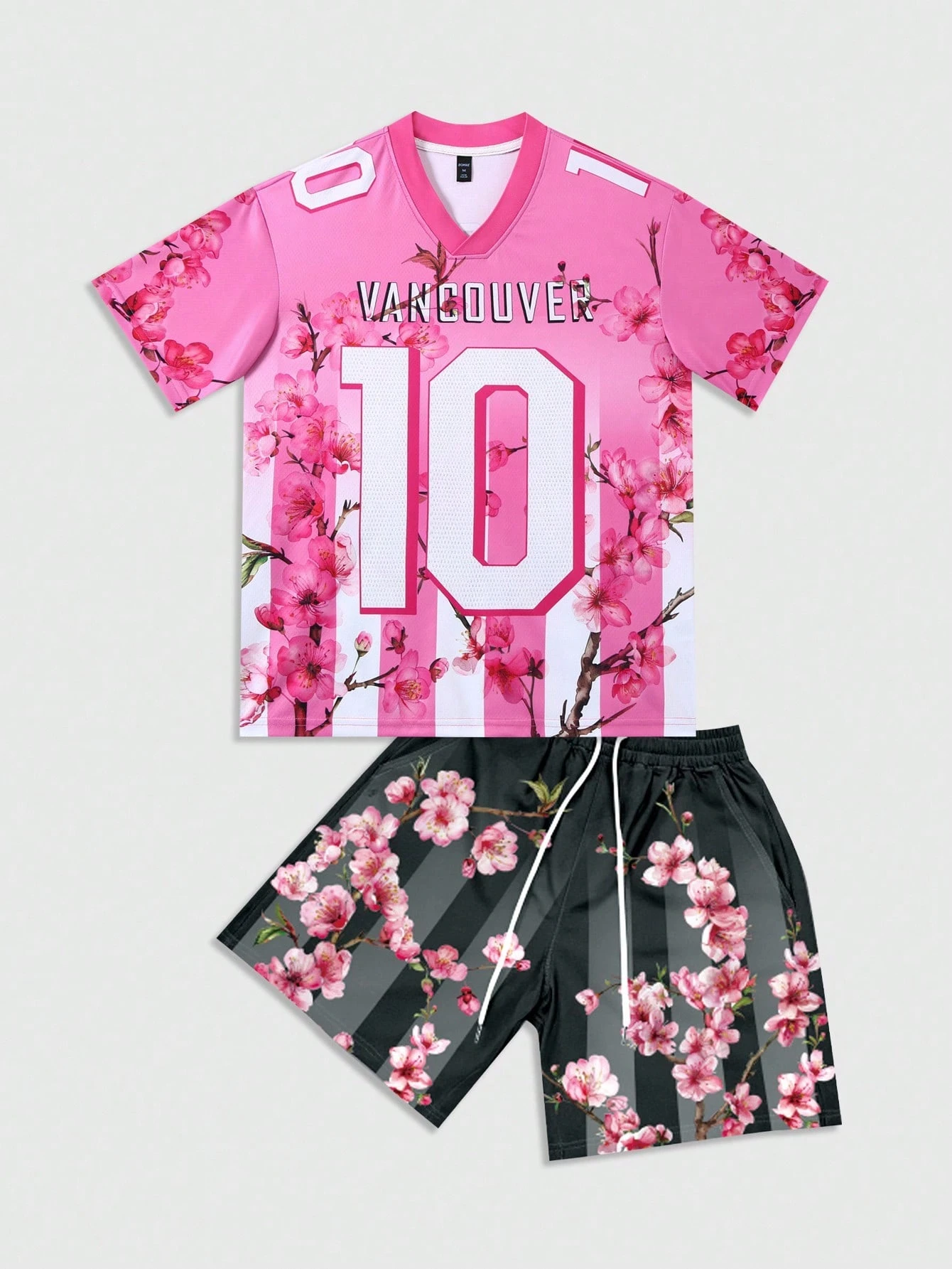 Prep Men's V-Neck Jersey Floral Print Short Sleeve T-Shirt And Shorts Casual Set