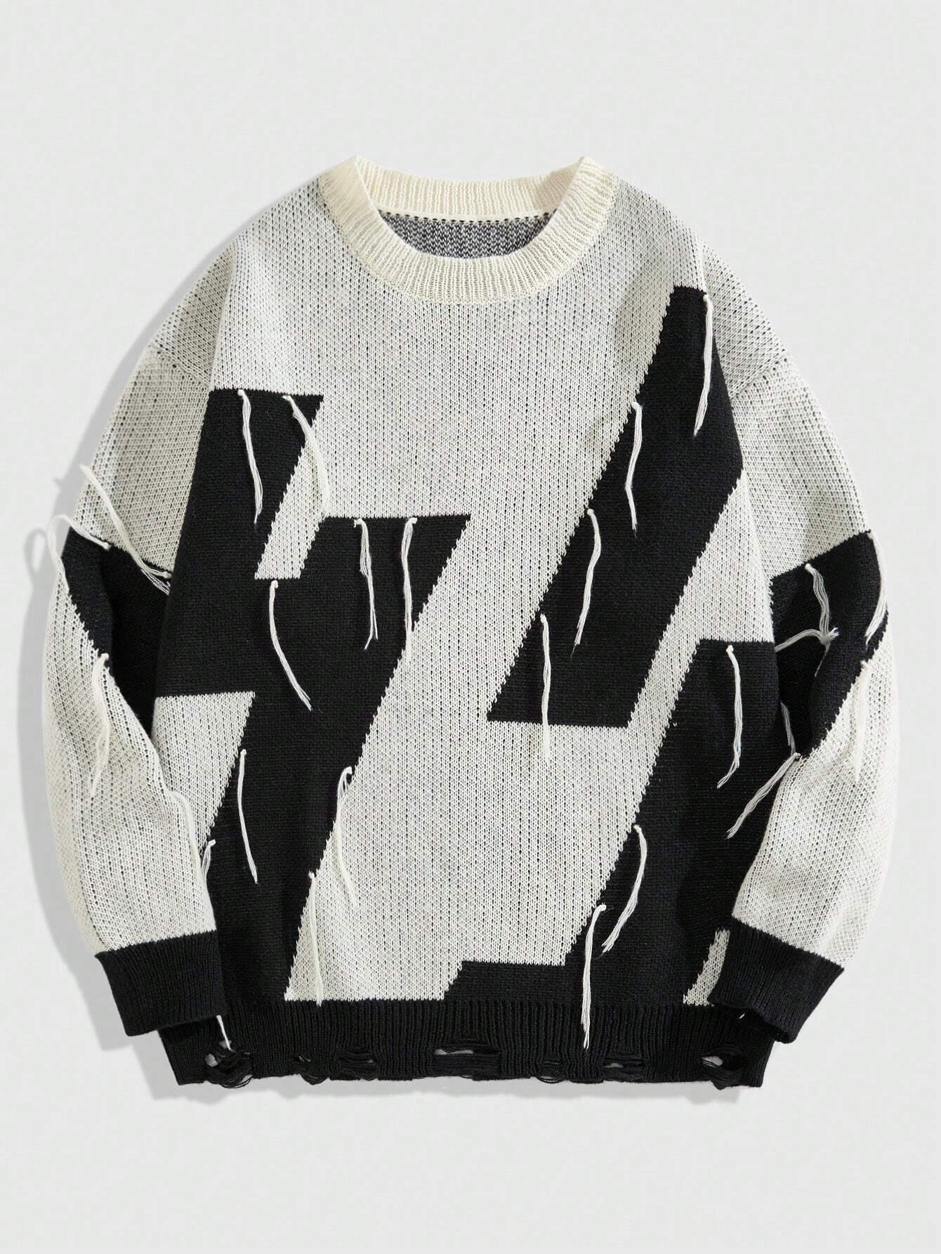 Prep Men's Vintage Streetwear Crew Neck Dual Color Patchwork Fringe Pullover Sweater