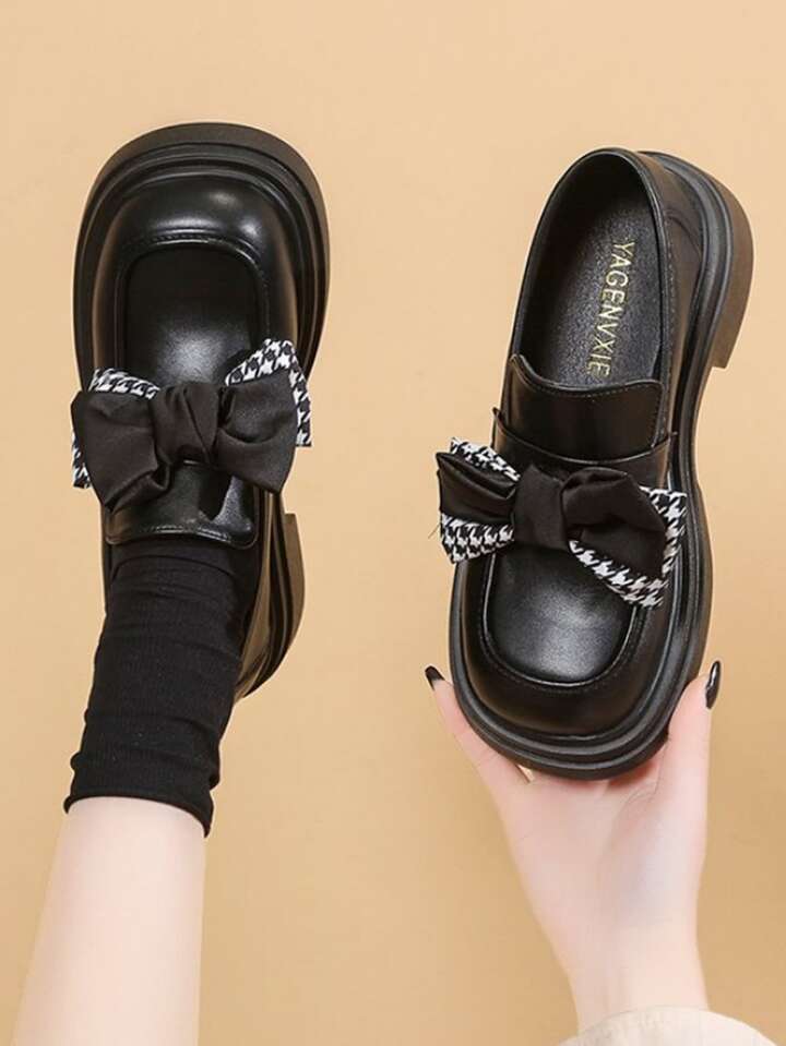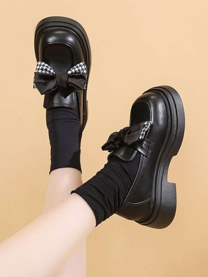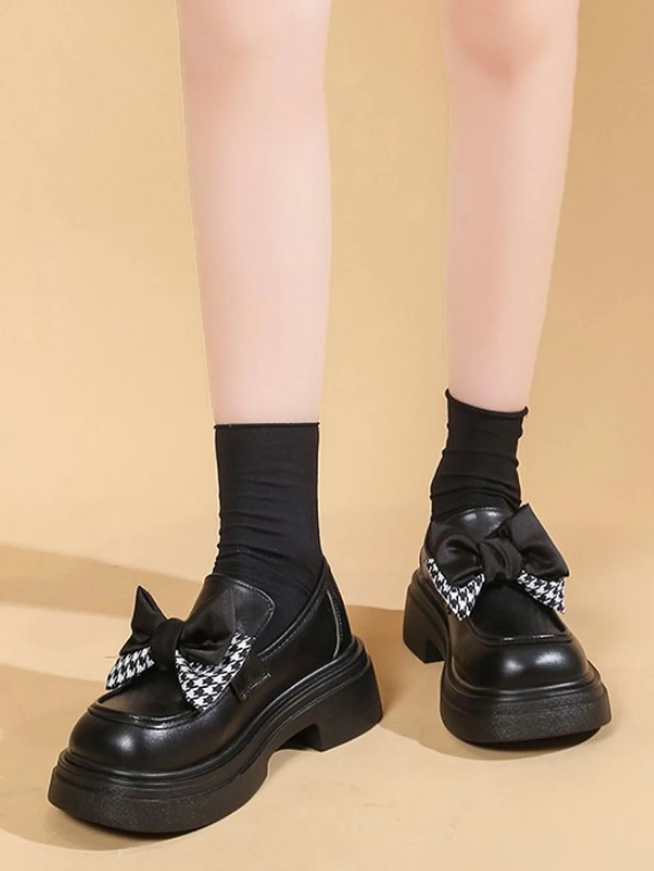 Preppy Black Loafer Shoes Women Houndstooth Pattern Bow Decor Flatform Shoes